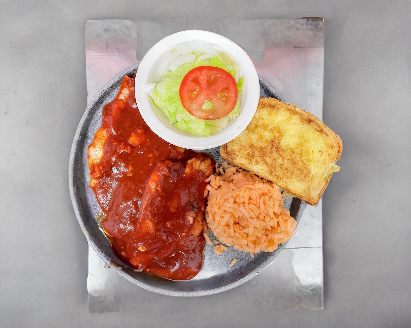 ORDEN DE CAMARONES COCINADOS CON SALSA RANCHERA ACOMPAÑADOS DE UNA PORCION DE ARROZ, UNA PORCION DE LECHUGA, UNA PORCION DE PAPAS, PAN Y ADEREZO DE LA CASA