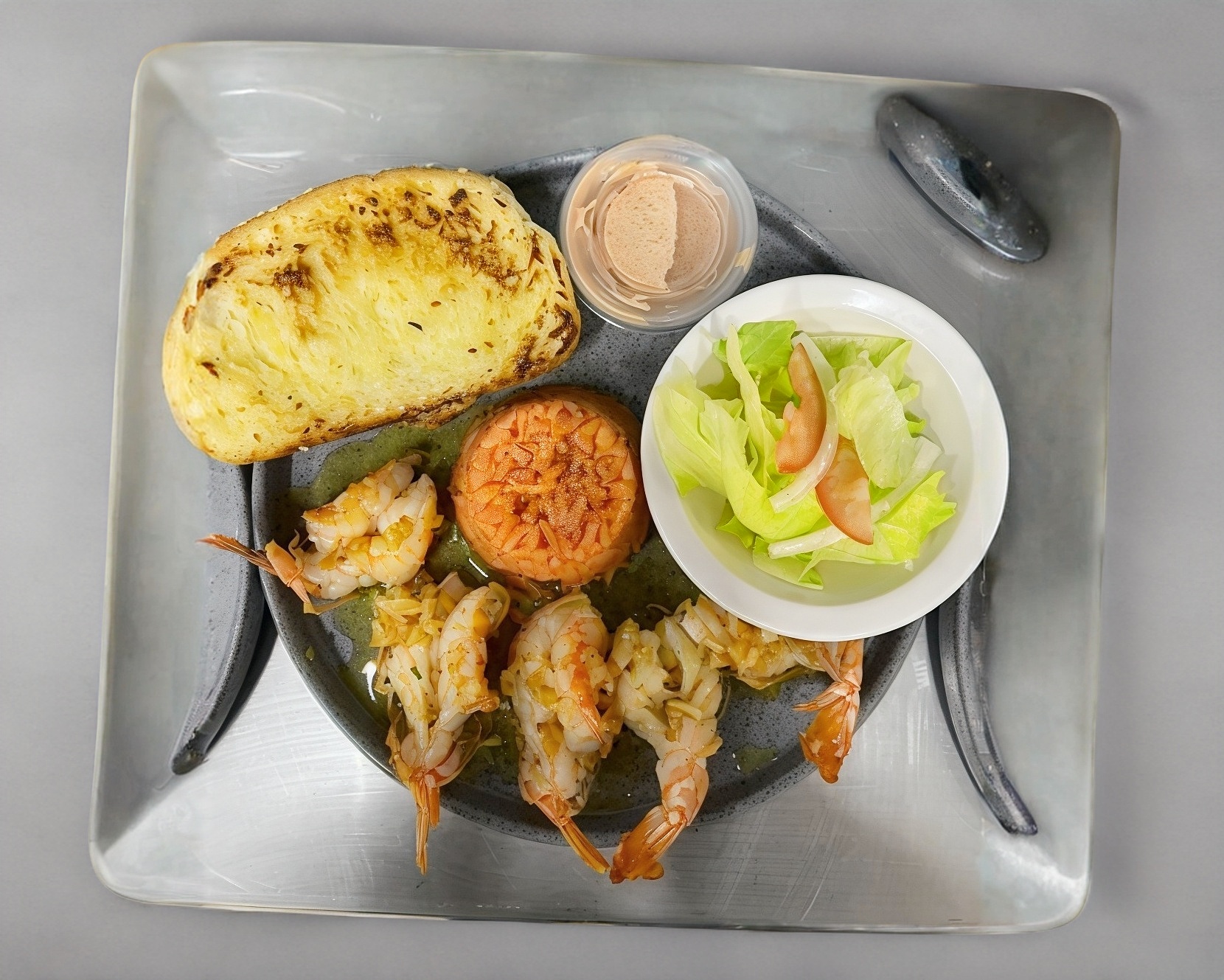 ORDEN DE CAMARONES COCINADOS AL MOJO DE AJO ACOMPAÑADOS DE UNA PORCION DE ARROZ, UNA PORCION DE LECHUGA, UNA PORCION DE PAPAS, PAN Y ADEREZO DE LA CASA