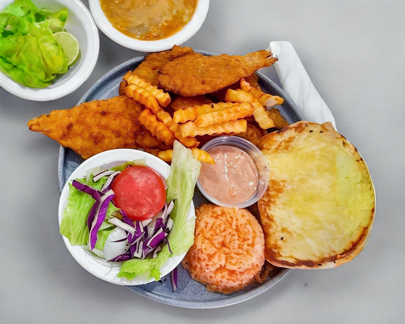 PAN ARTESANA, FILETE DE TRUCHA EMPANIZADO, CAMARONES GRATINADO CON QUESO GOUDA, LECHUGA TOMATE, ADEREZO DE CHIPOTLE, ACOMPAÑADA DE 150GR DE PAPAS FRITAS Y ADEREZO DE LA CASA