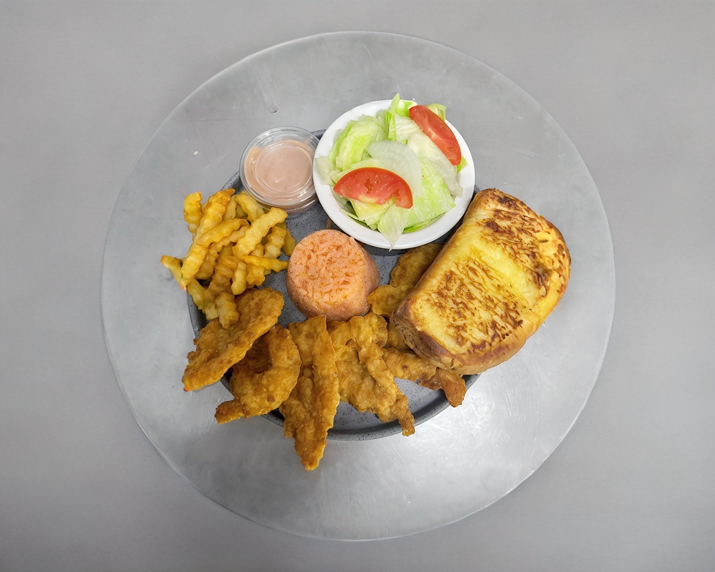 ORDEN DE 9 CAMARONES EMPANIZADOS ACOMPAÑADOS DE UNA PORCION DE ARROZ, UNA PORCION DE LECHUGA, UNA PORCION DE PAPAS, PAN Y ADEREZO DE LA CASA
