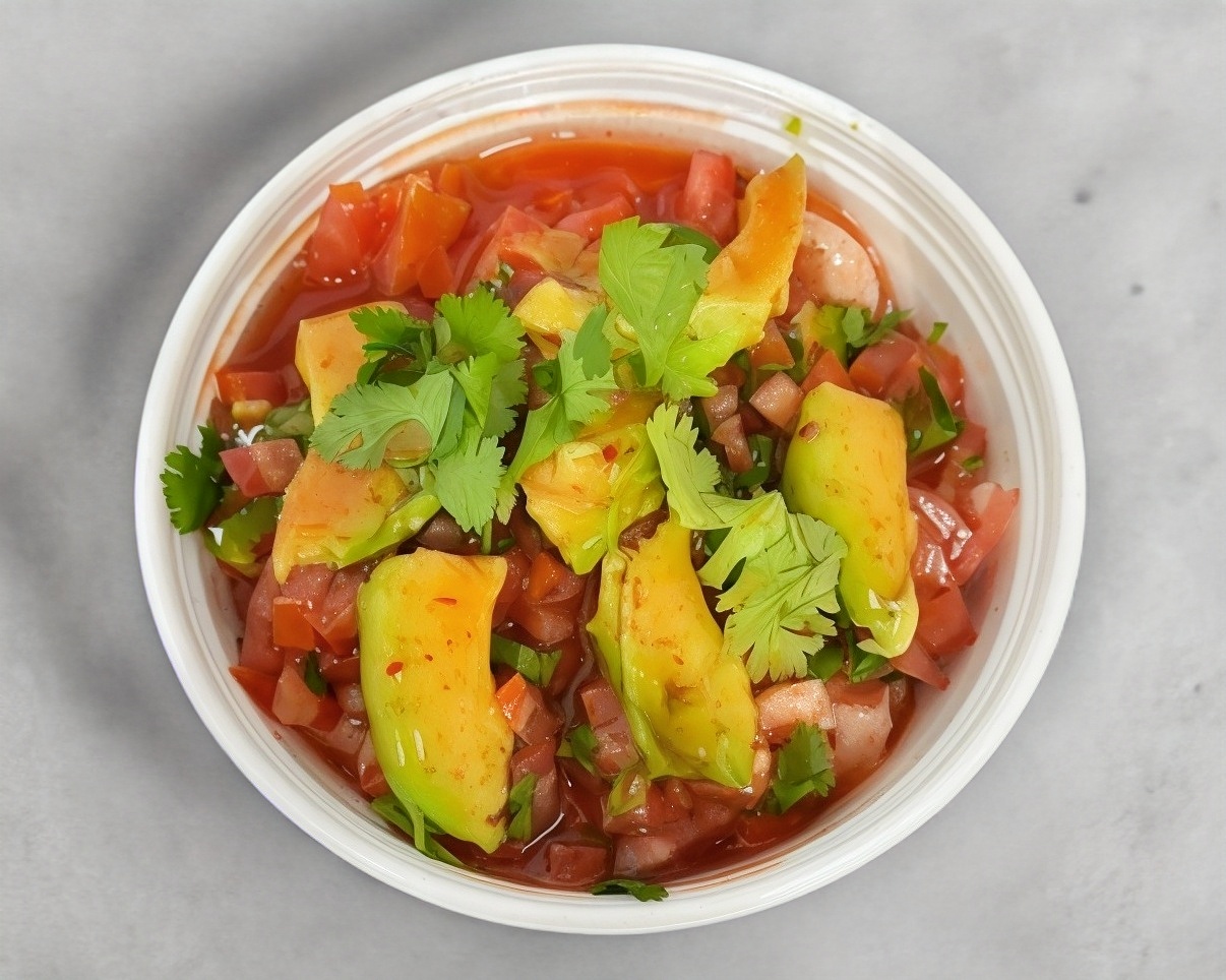AGUACHILE DE CAMARON CON NUESTRA SALSA ESPECIAL DE LA CASA ACOMPAÑADO DE PEPINO Y CEBOLLA