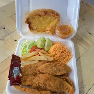 ORDEN DE FILETE DE LISA EMPANIZADO, ACOMPAÑADOS DE UNA PORCION DE ARROZ, UNA PORCION DE LECHUGA, UNA PORCION DE PAPAS, PAN Y ADEREZO DE LA CASA