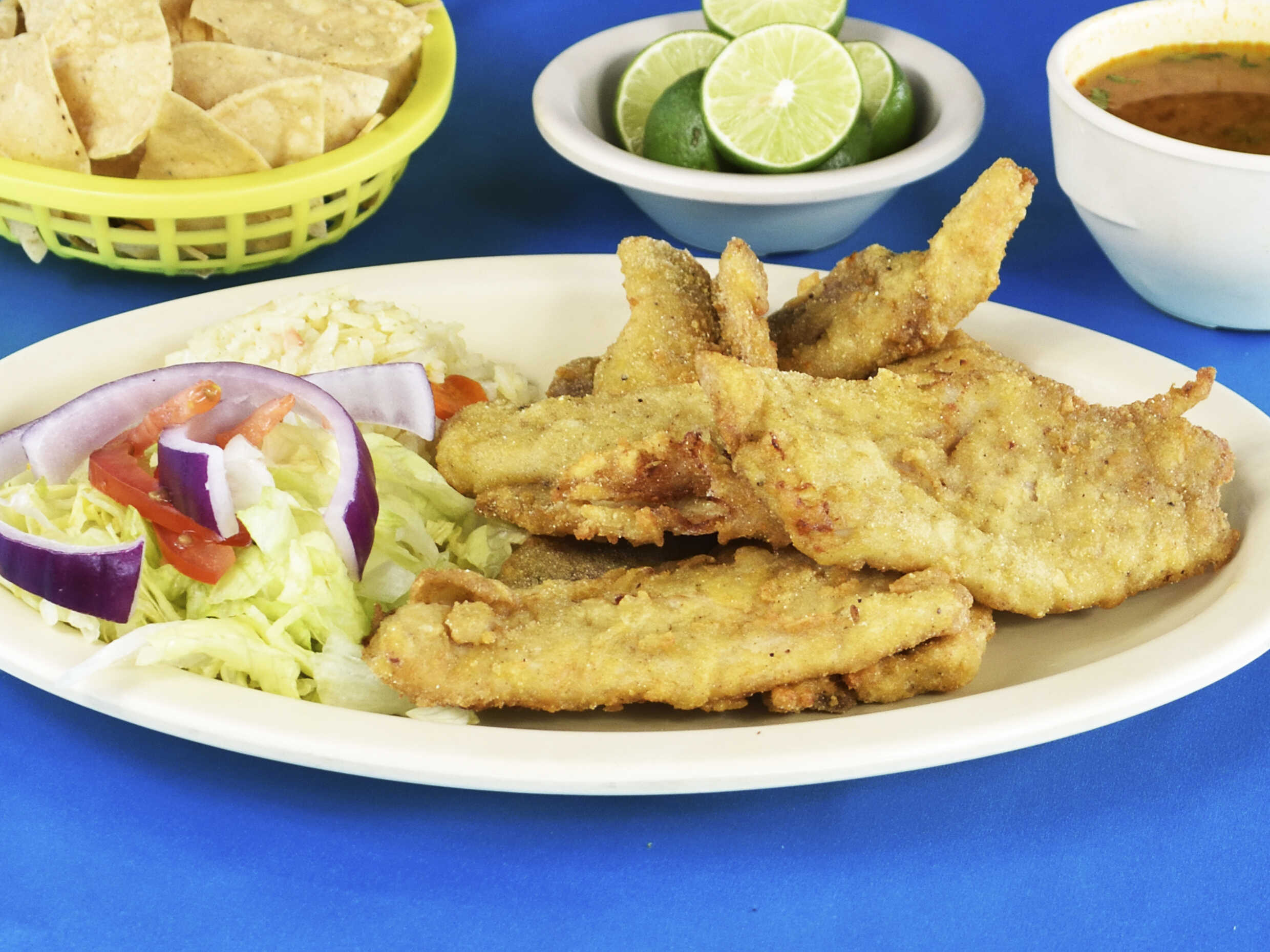 Filete empanizado con totopos, limones, salsa y consomé de 8 onzas.