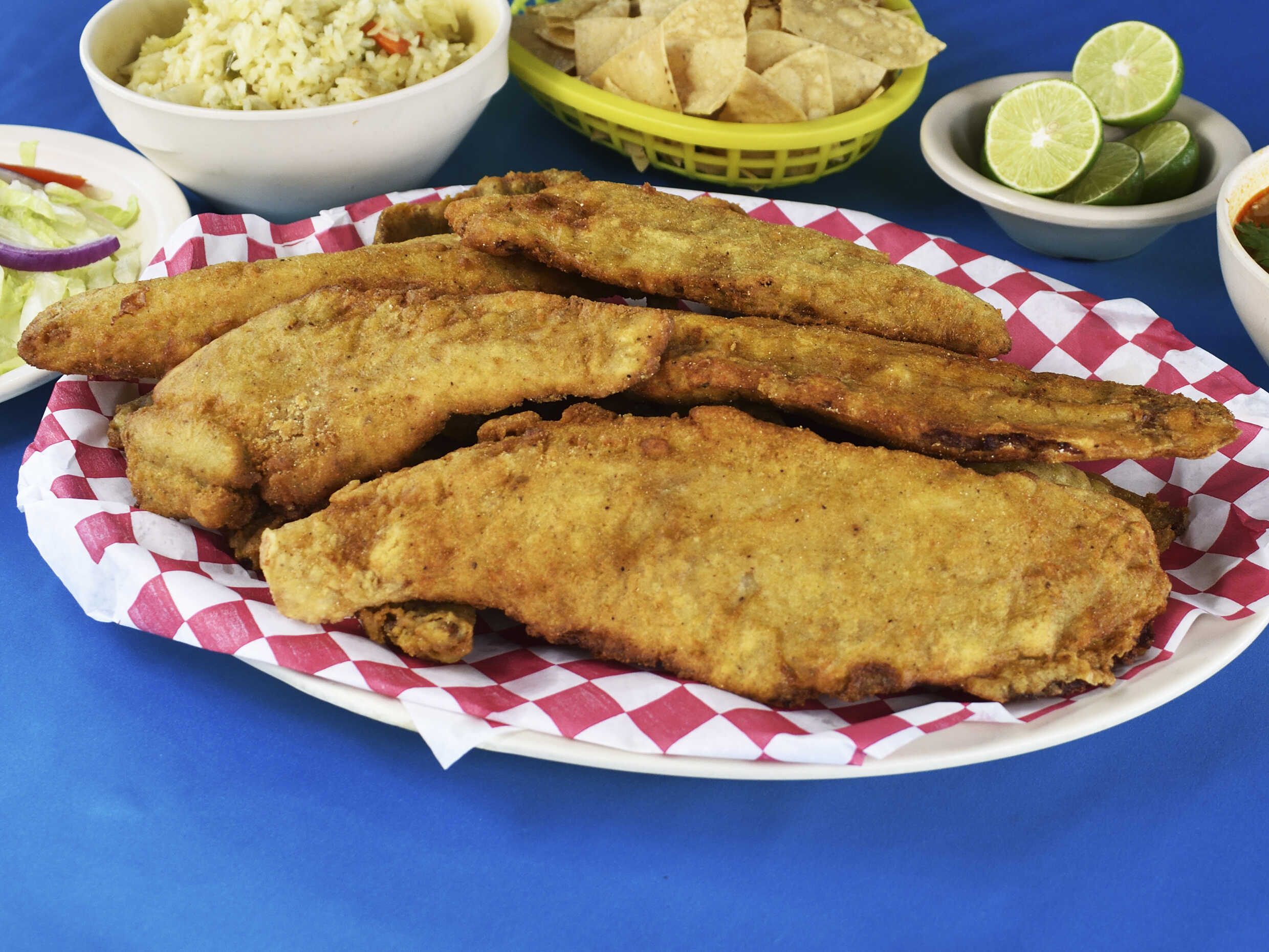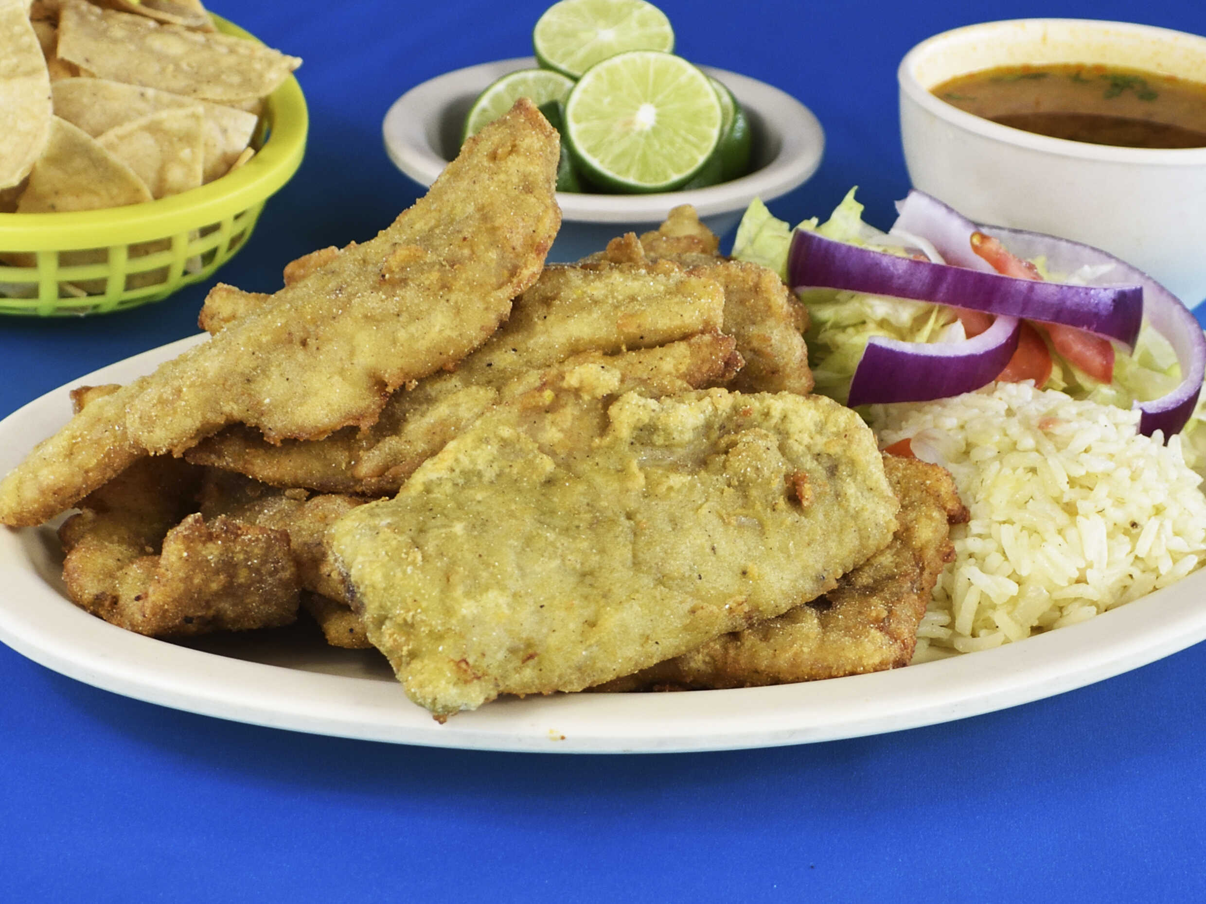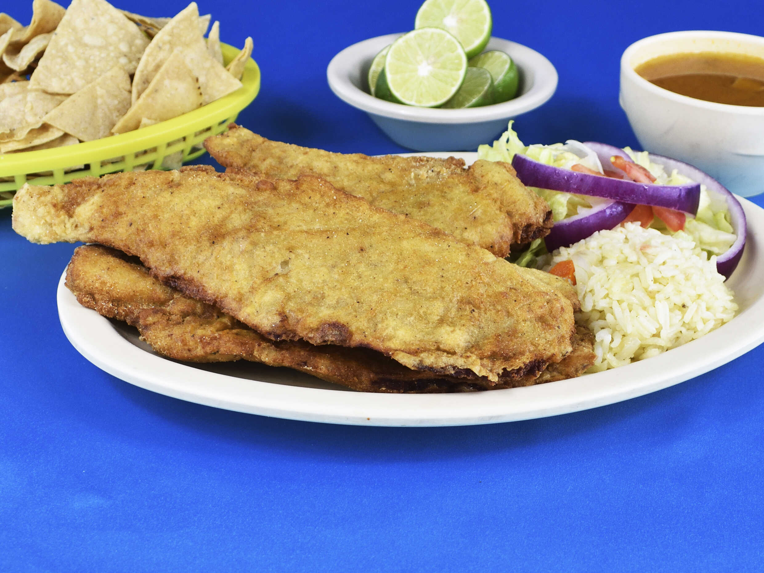 Filete empanizado con arroz, ensalada, totopos, limones, salsa y consomé de 16 onzas.