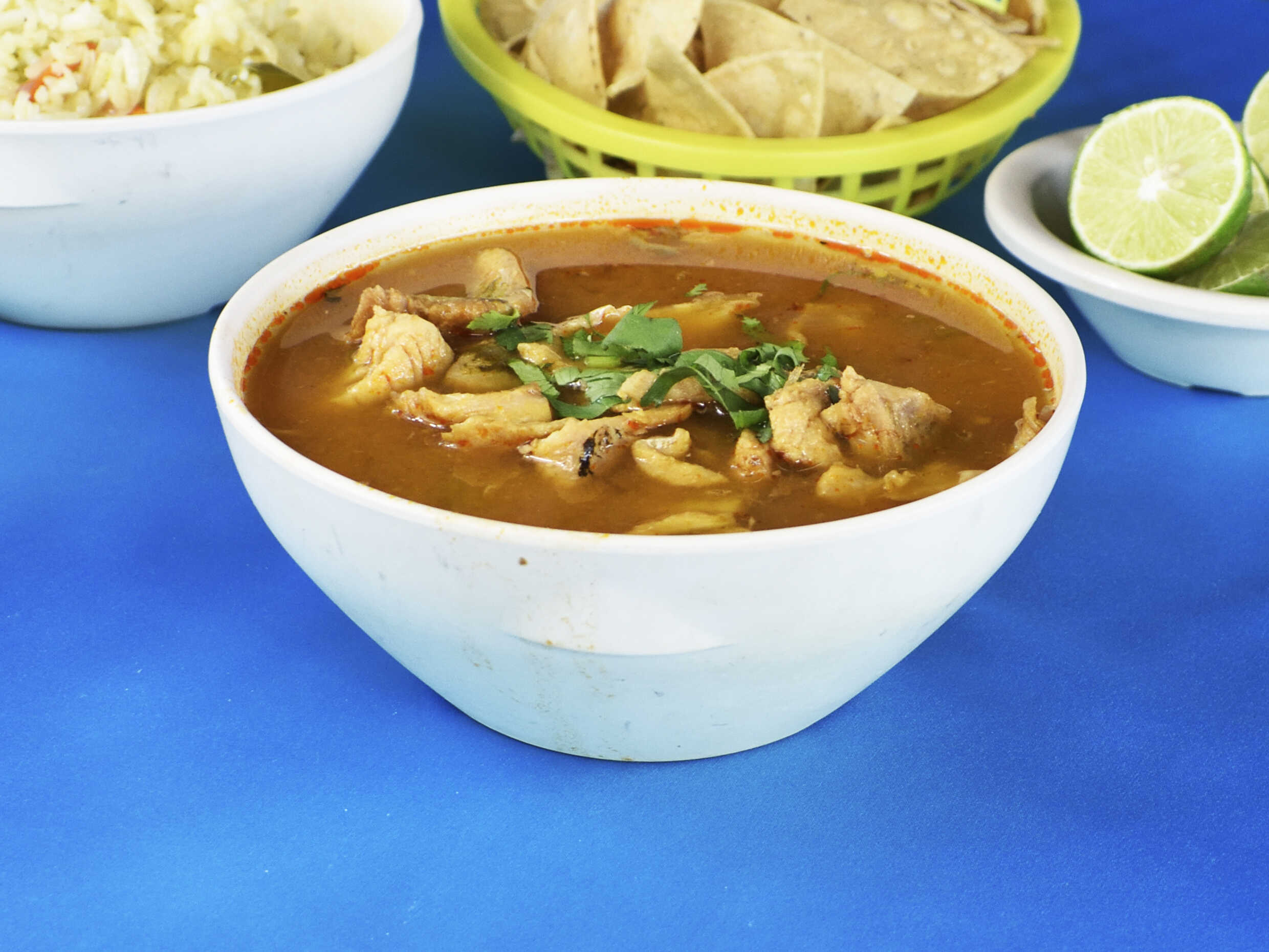 Ensalada, totopos, limones, salsa, consomé de 8 oz.