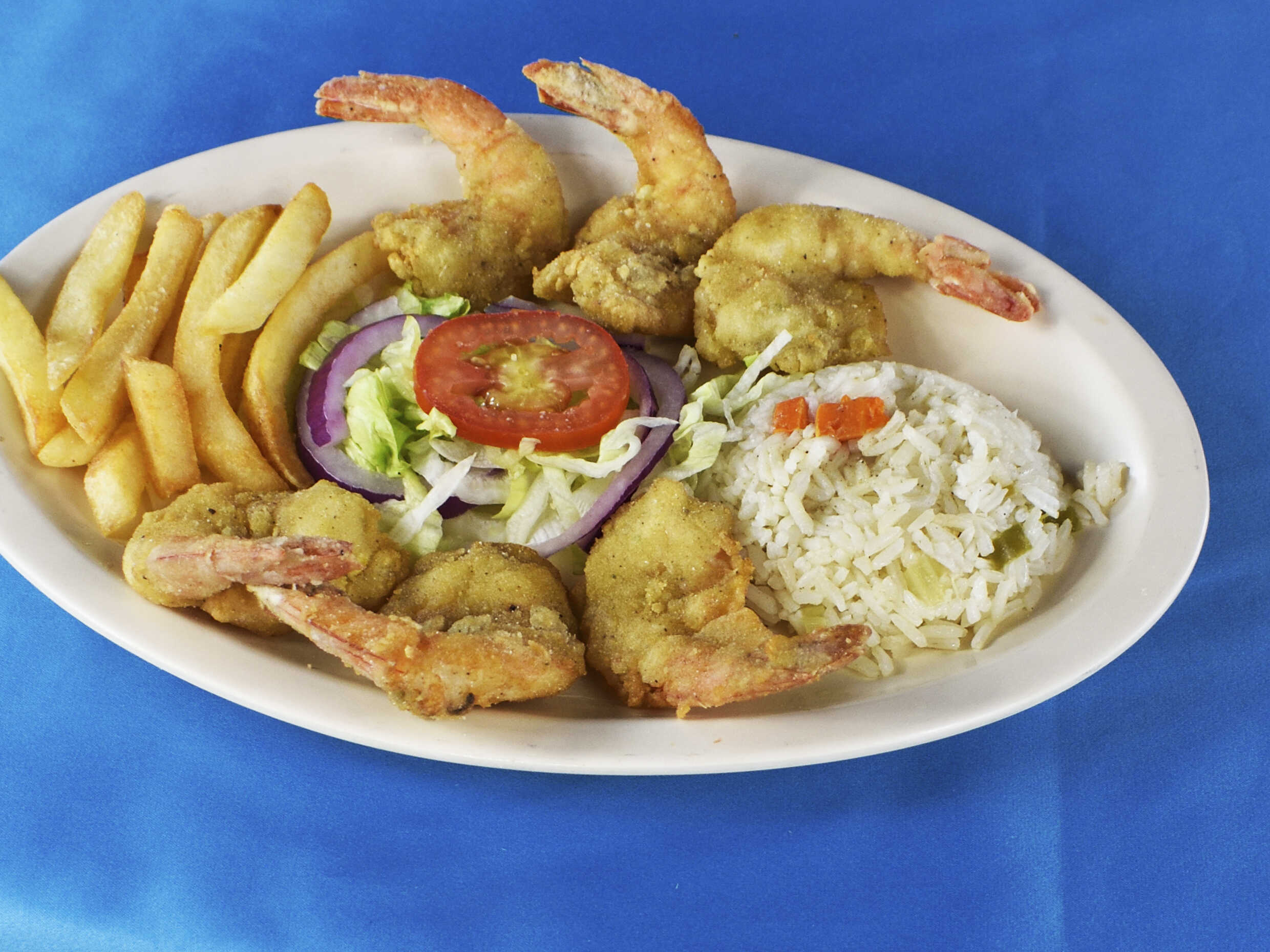 Para 2 a 3 personas, incluye aros de cebolla, papas fritas, filete empanizado, camarones rancheros.
