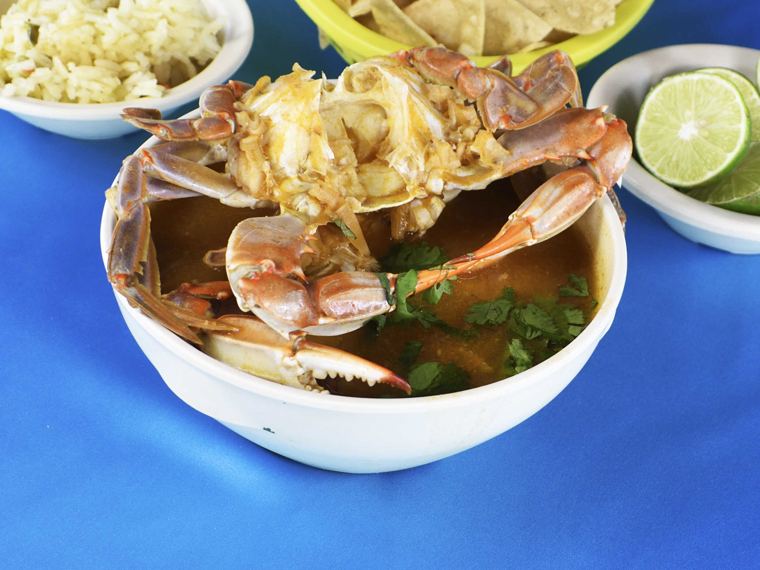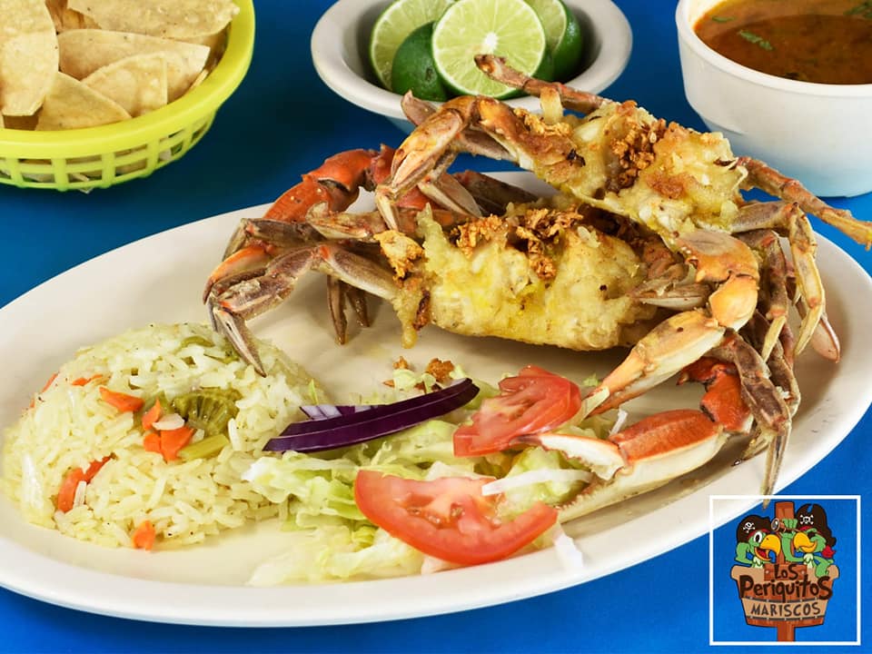 Pescado, camarón, calamar y jaiba, complementos: arroz, totopos, limón y salsa.