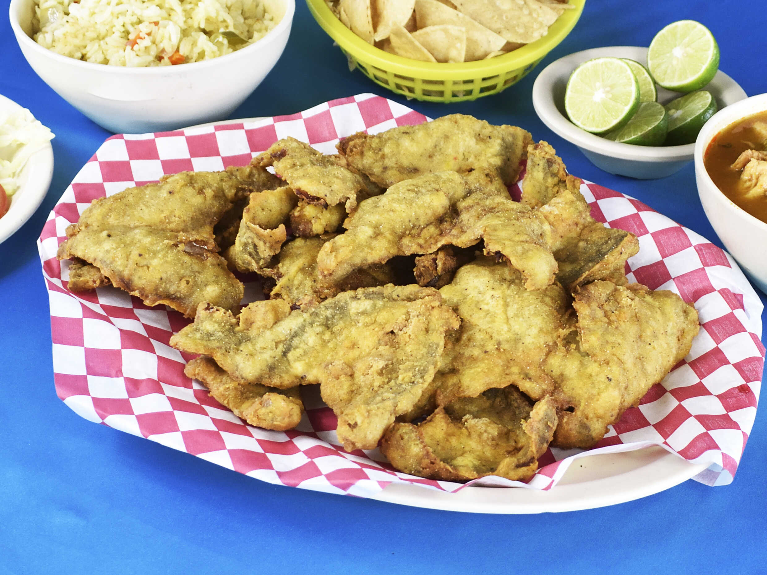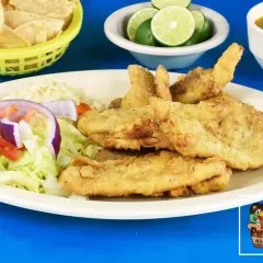 Filete empanizado con totopos, limones, salsa y consomé de 16 onzas.