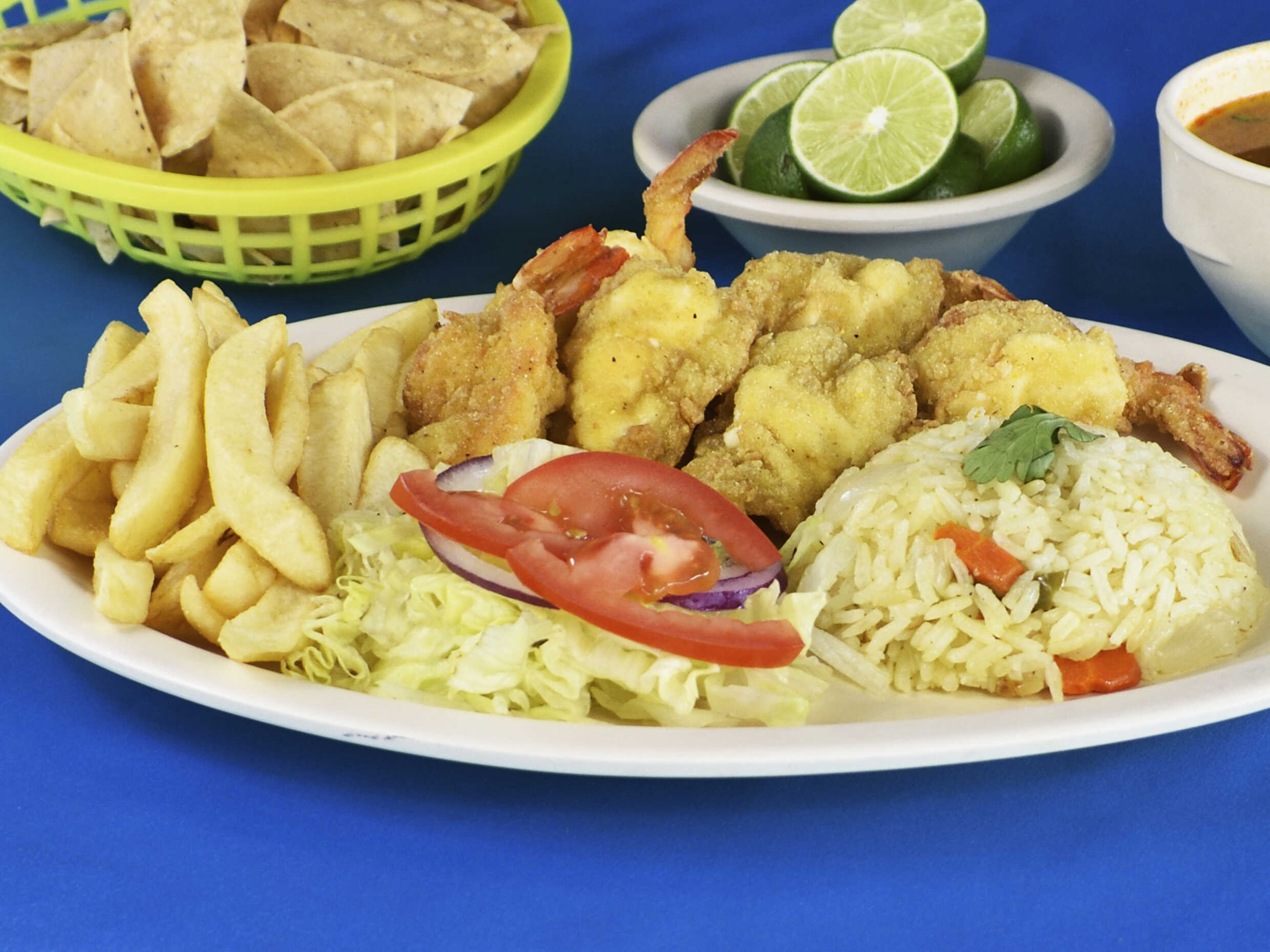 Camarones empanizados con arroz, ensalada, totopos, limones, salsa, consomé de 8 oz.