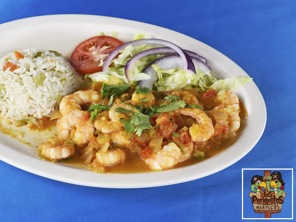 Camarones guisados con tomate, chile y cebolla, complementos arroz, ensalada, totopos, limones.
