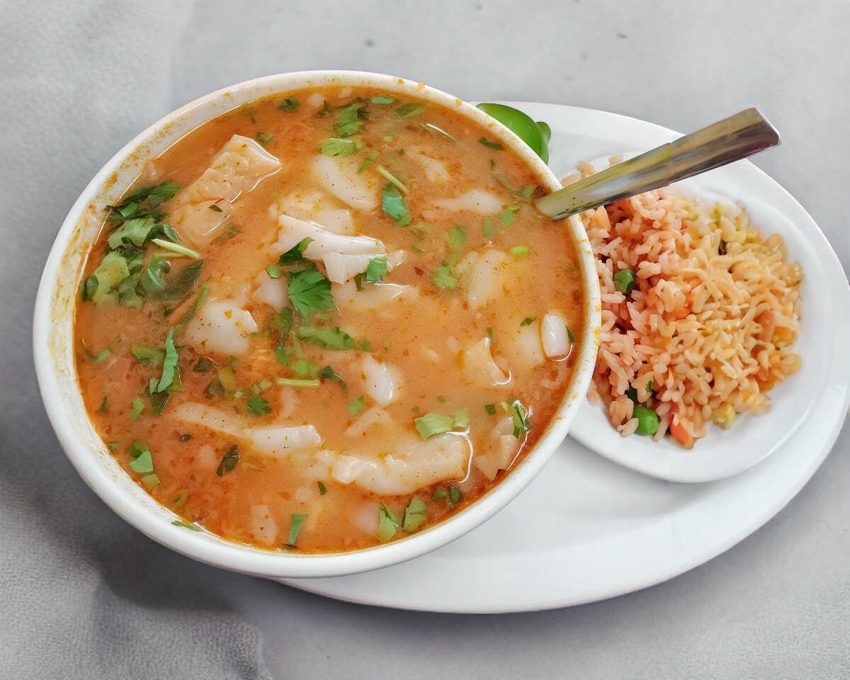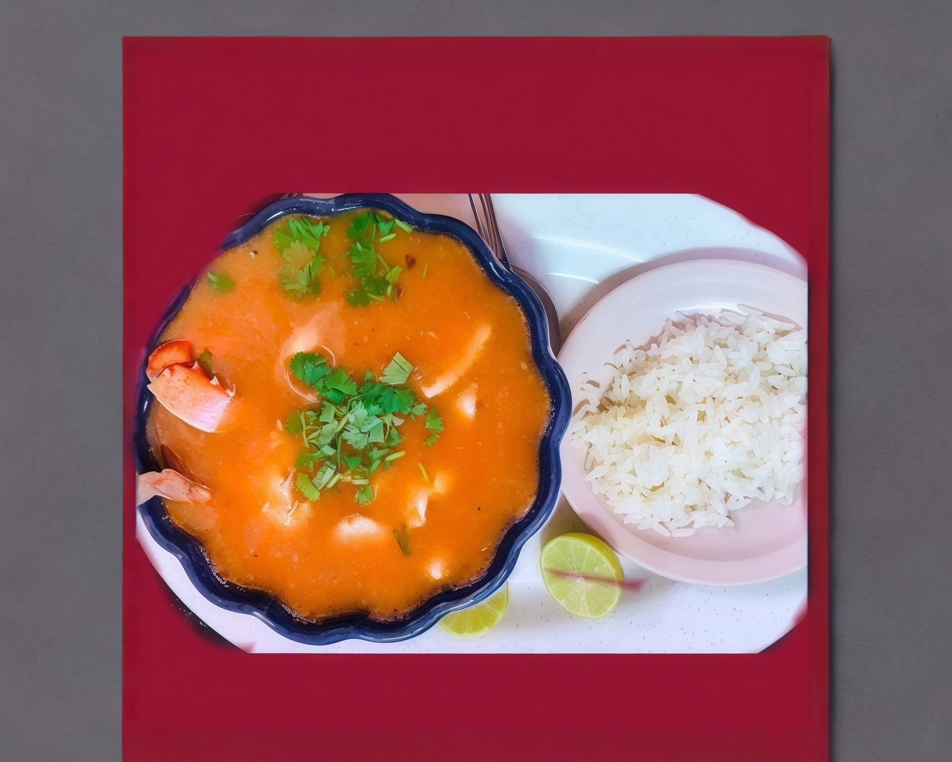 Sopa preparada con camarones, jaiba, pescado y calamar.