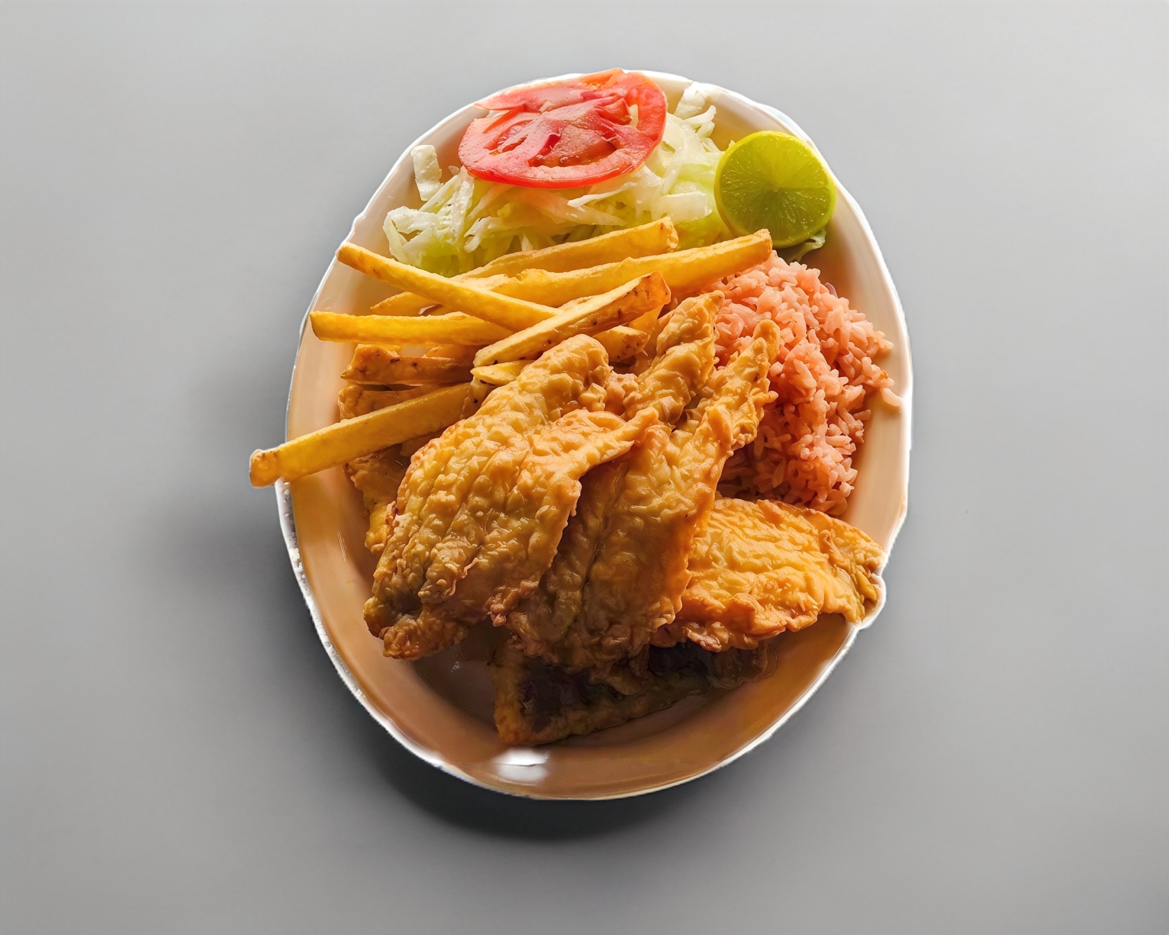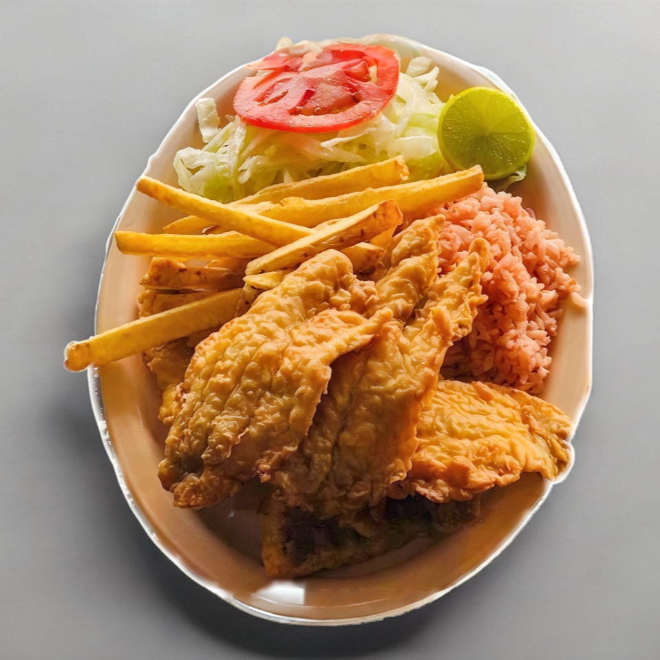 Acompañado de papas fritas, ensalada, arroz, y tortillas.