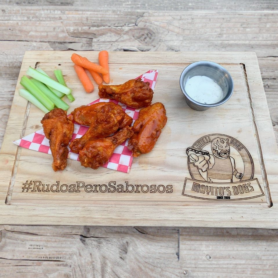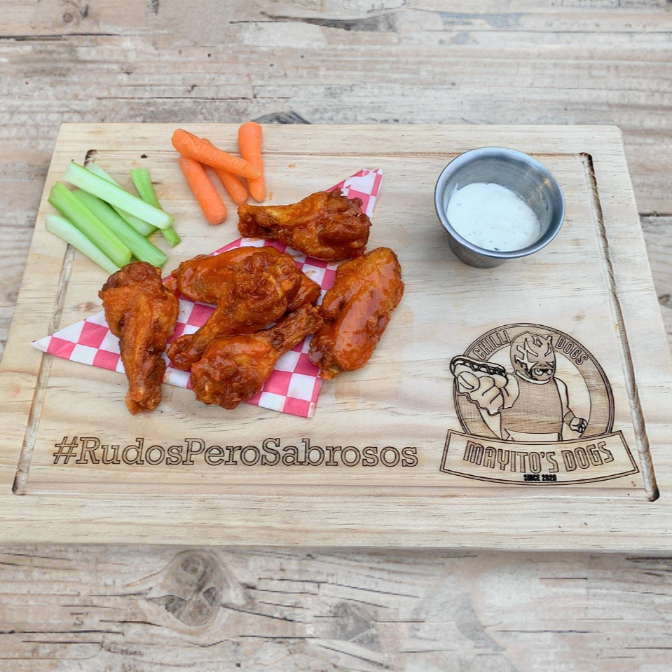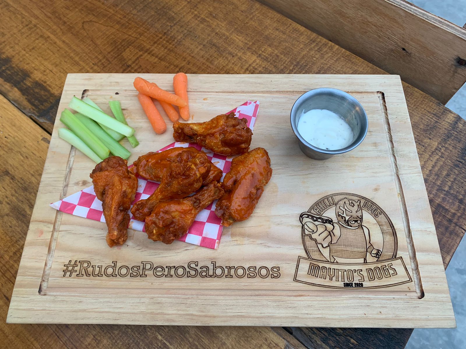 Hot Dog con boneless buffalo queso amarillo y ranch