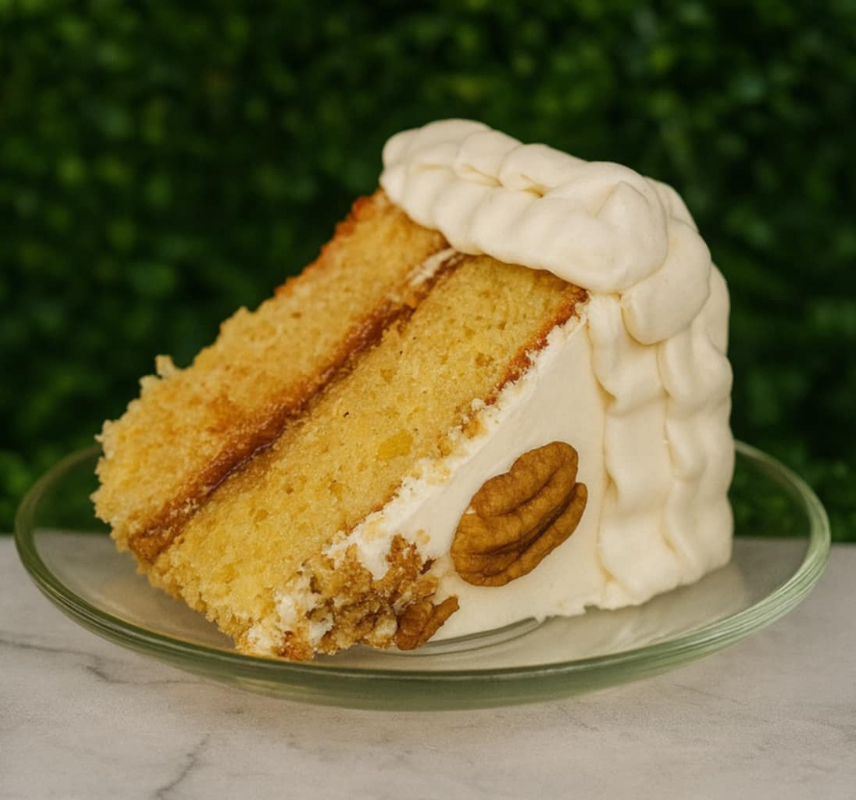 Rebanada de Pastel Sabor Plátano Relleno con Dulce de Nuez Cubierta de Betún Queso Crema con Trocitos de Nuez