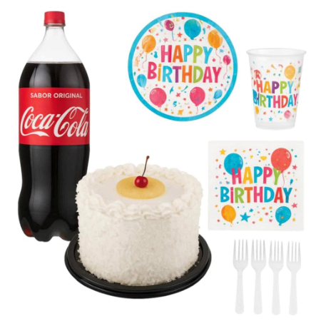 Disfruta tu celebración sin preocupaciones porque te falto algo, con nuestro paquete fiesta no tienes que preocuparte por nada. Ya que incluye: 1 pastel para 16 personas, 1 paquete de platos festivos, 1 paquete de vasos festivos, 1 paquete de servilletas festivas, 1 paquete de tenedores, 1 refresco 2.5 litros.