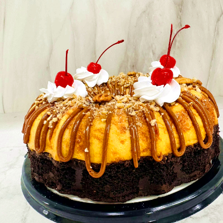 Delicioso postre que combina dos texturas y sabores contrastantes en un solo postre: el suave y cremoso flan con un esponjoso pastel de chocolate. Decorado con dulce de leche, trocitos de nuez, suave crema y cerezas.