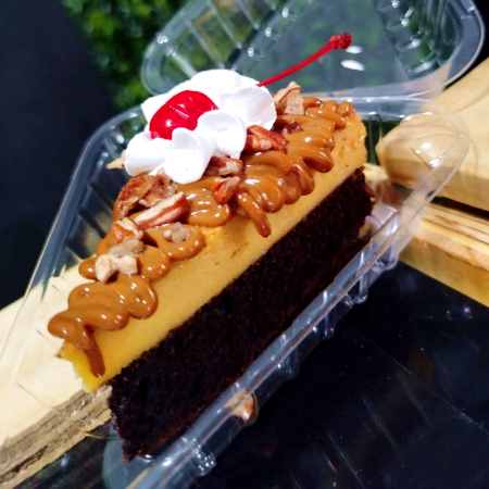 Deliciosa rebanada de nuestro choco flan que combina dos texturas y sabores contrastantes en un solo postre: el suave y cremoso flan con un esponjoso pastel de chocolate. Decorado con dulce de leche, trocitos de nuez, suave crema y cereza.