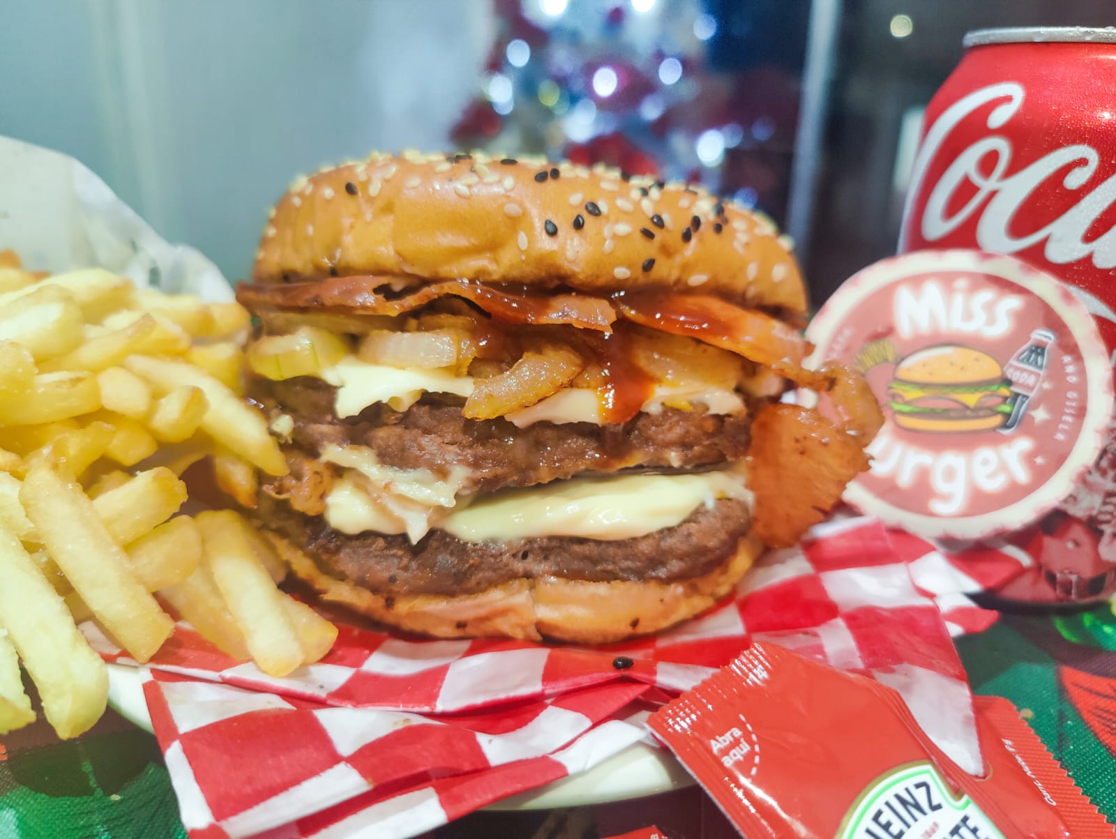 Doble carne de sirloin 150 gr, triple queso manchego, cebolla caramelizada, tocino, salsa BBQ y mayonesa, con papas y refresco.
