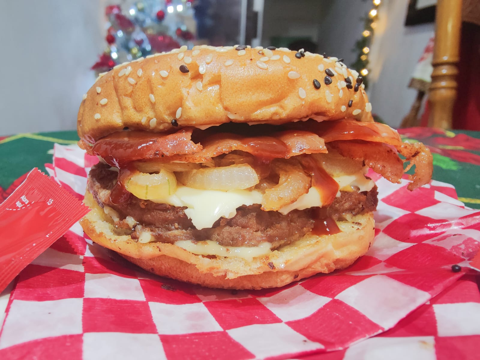 Doble carne de sirloin 150 gr, triple queso manchego, cebolla caramelizada, tocino, salsa BBQ y mayonesa.