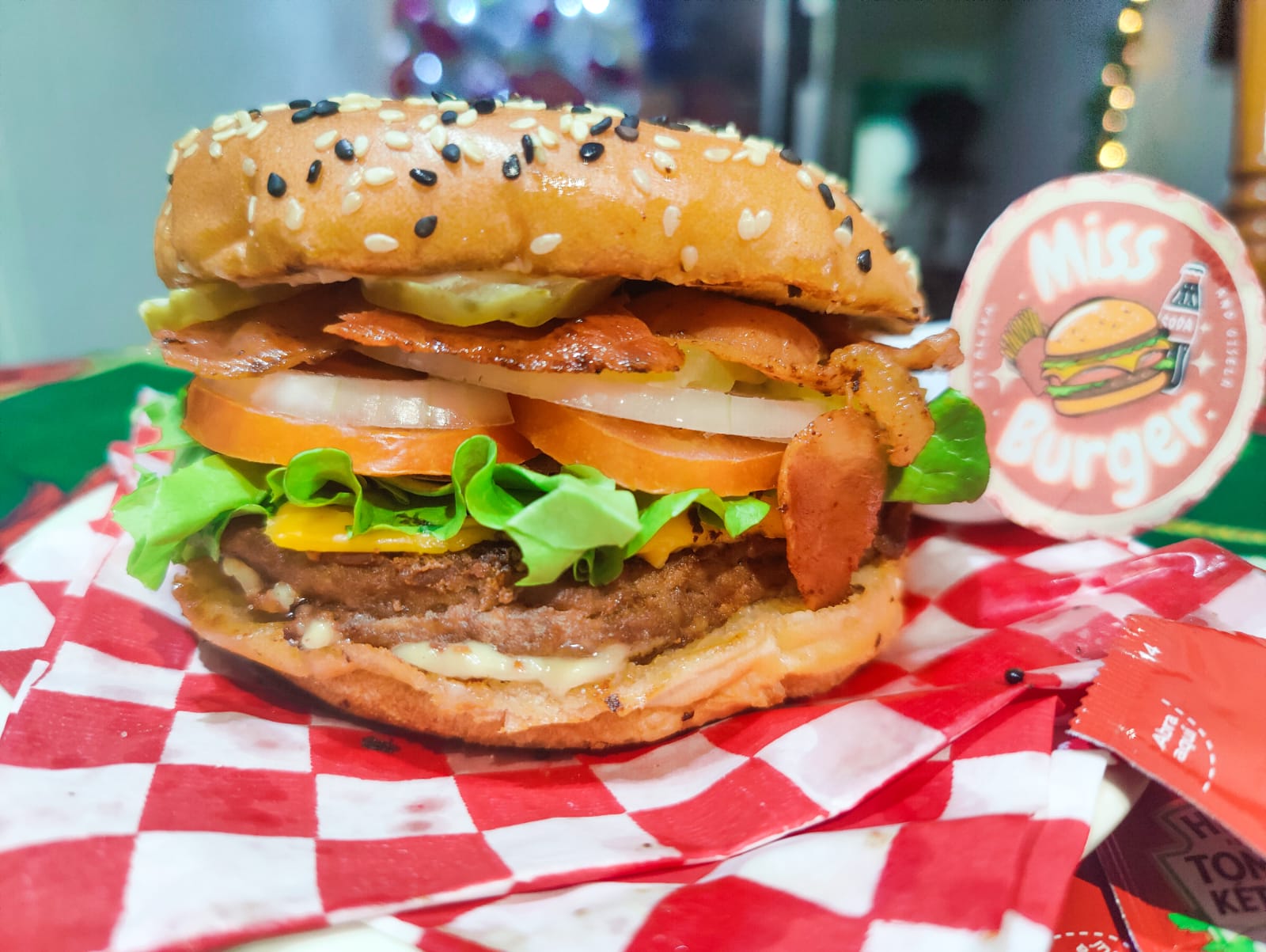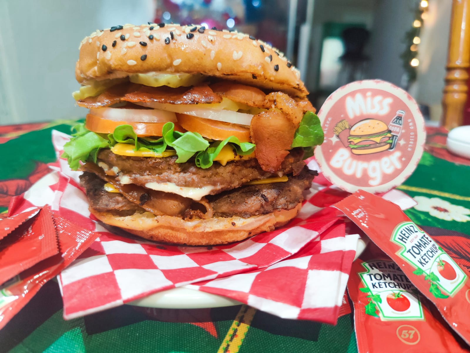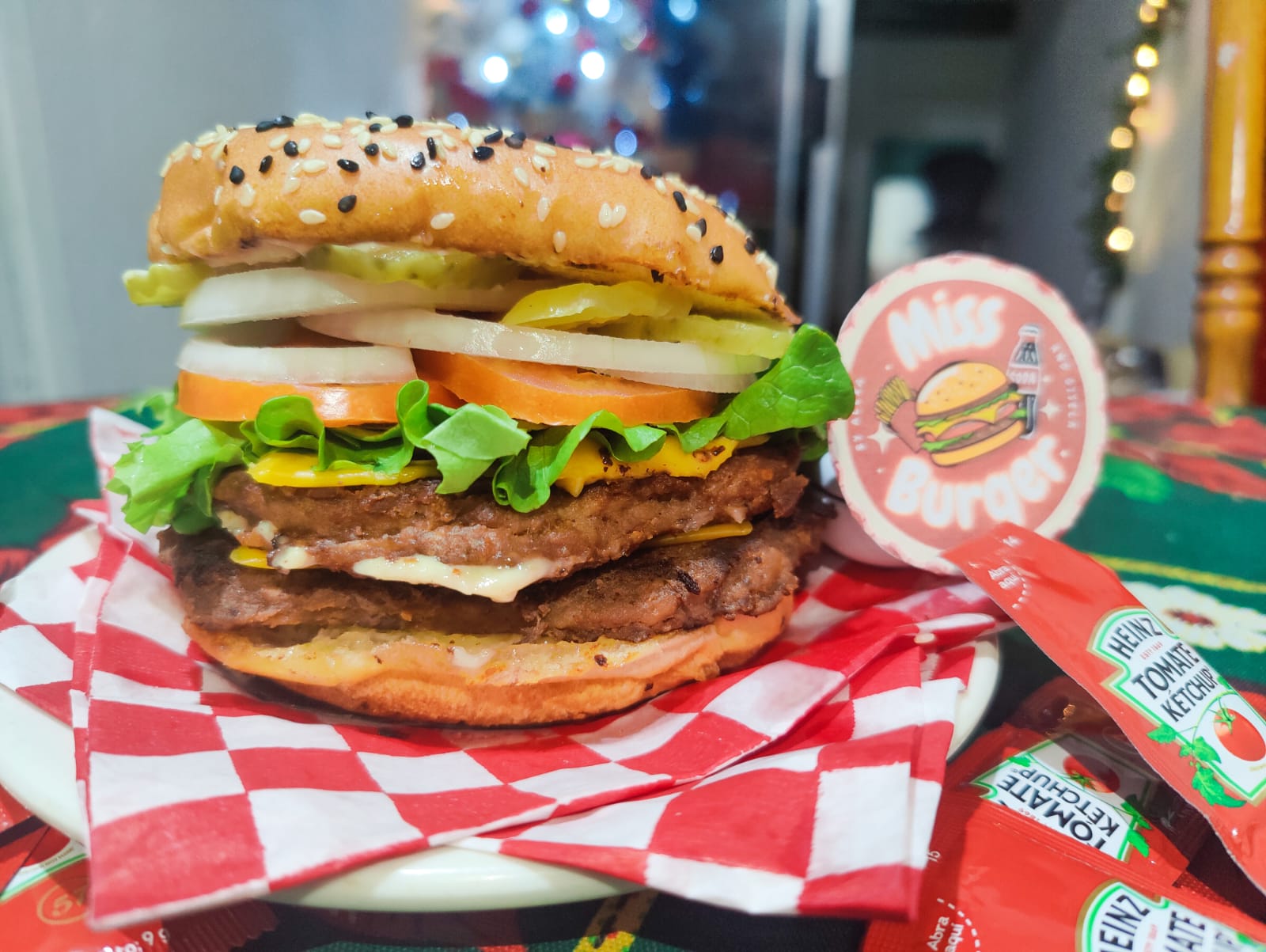 Doble carne de sirloin 150 gr, doble queso amarillo, tocino, lechuga, tomate, cebolla, pepinillos, mayonesa, cátsup y mostaza.