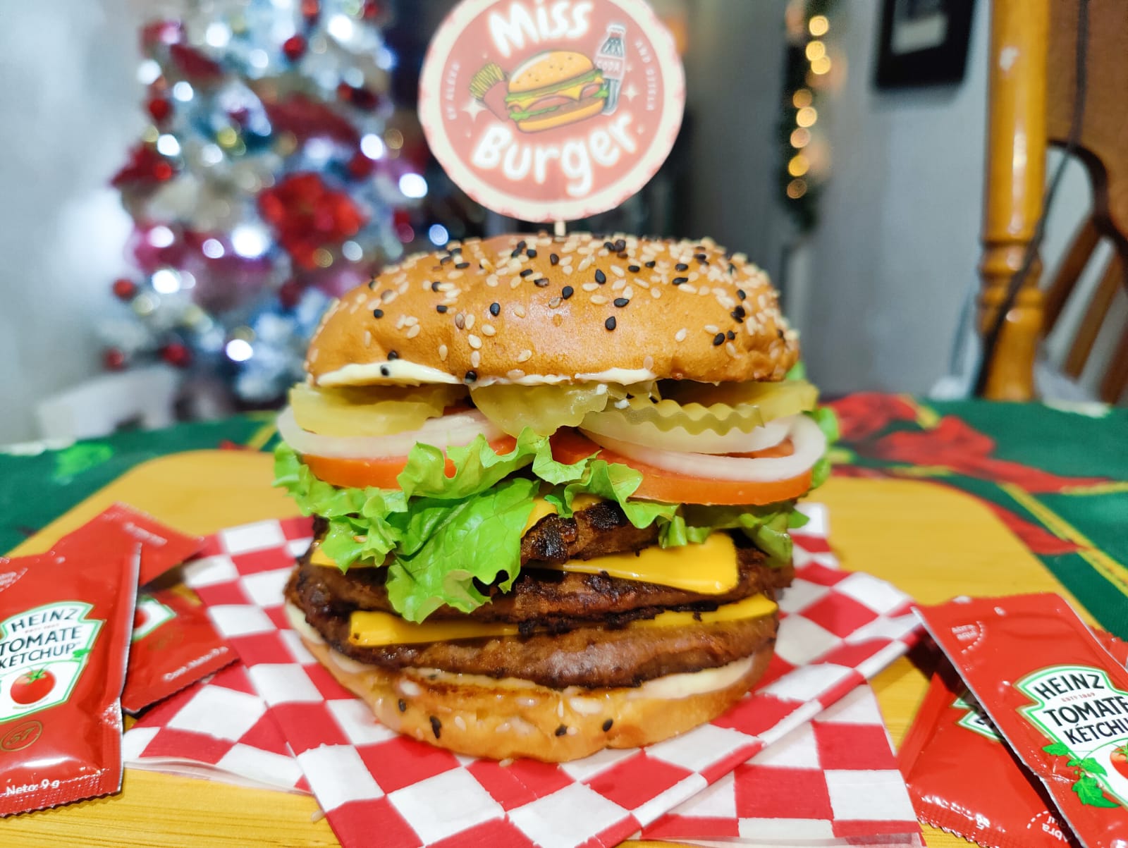 Doble carne de sirloin 150 gr, doble queso amarillo, lechuga, tomate, cebolla, pepinillos, mayonesa, cátsup y mostaza.