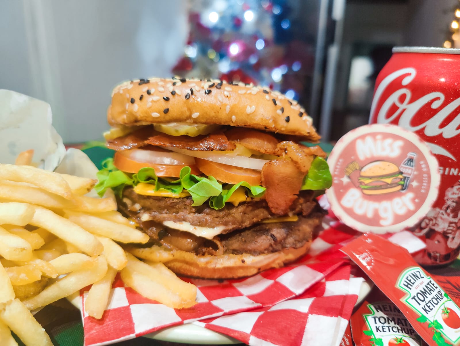 Doble carne de sirloin 150 gr, doble queso amarillo, tocino, lechuga, tomate, cebolla, pepinillos, mayonesa, cátsup y mostaza, con papas y refresco.