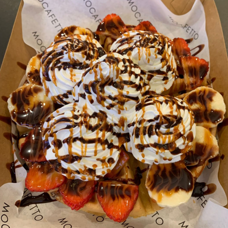 Waffle con fresa, plátano, crema batida, chocolate liquido y cajeta.