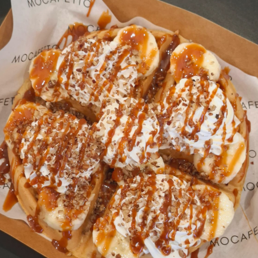 Waffle con plátano, cajeta, nuez, crema batida.