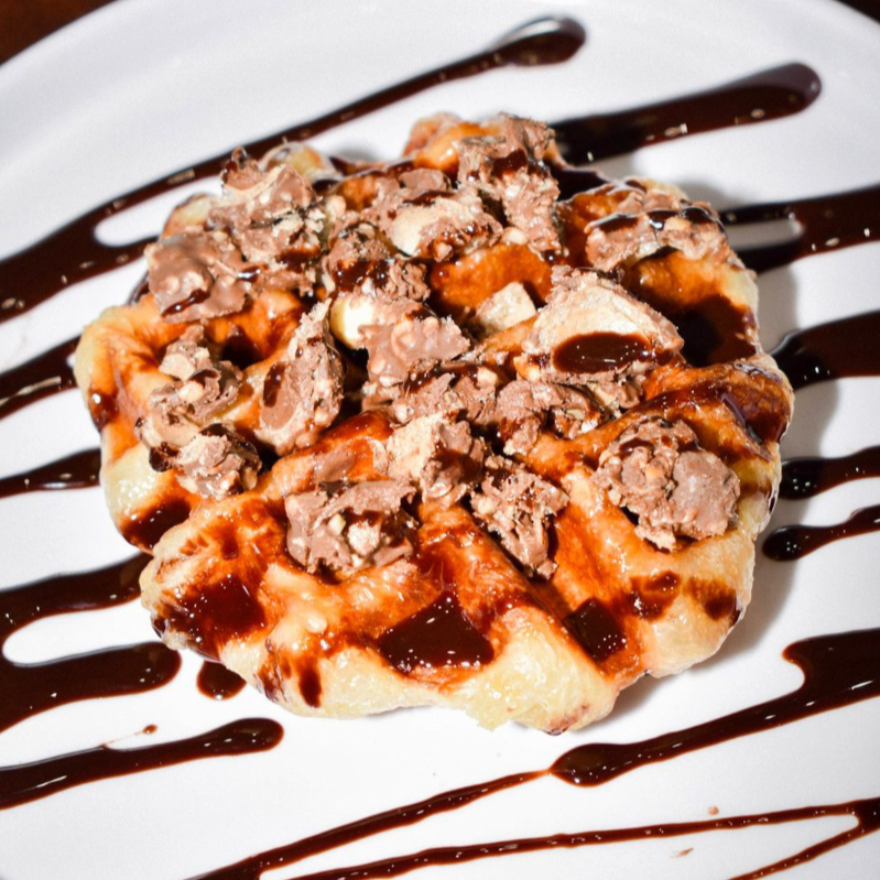 Waffle con Nutella, chocolate líquido, chispas de chocolate, oreo y crema batida.
