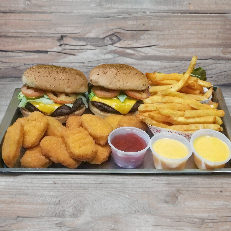 2 Hamburguesas con 2 porciones de papas y 12 nuggets y 2 refrescos
