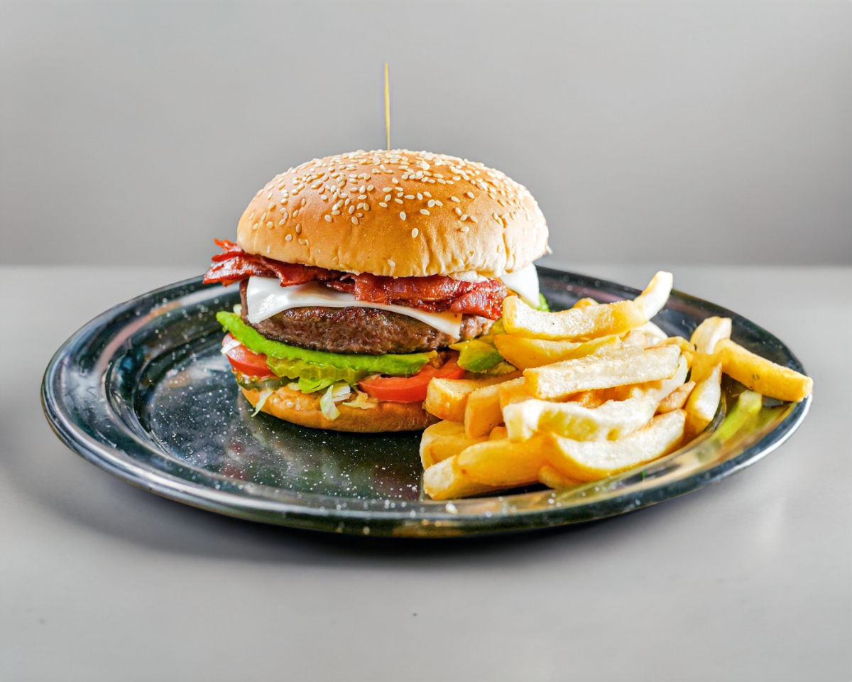 Hamburguesa de carne de res doble, verduras y aderezos.