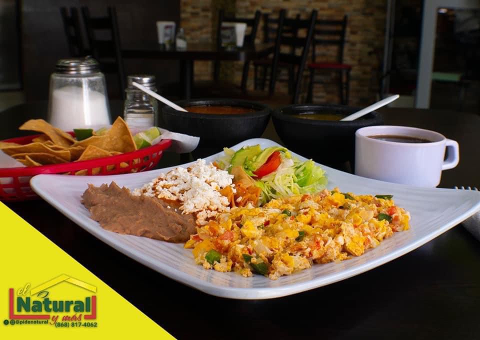 Revueltos a la mexicana, con porcion de frijoles y aguacate,