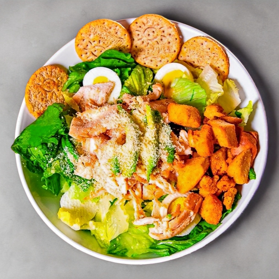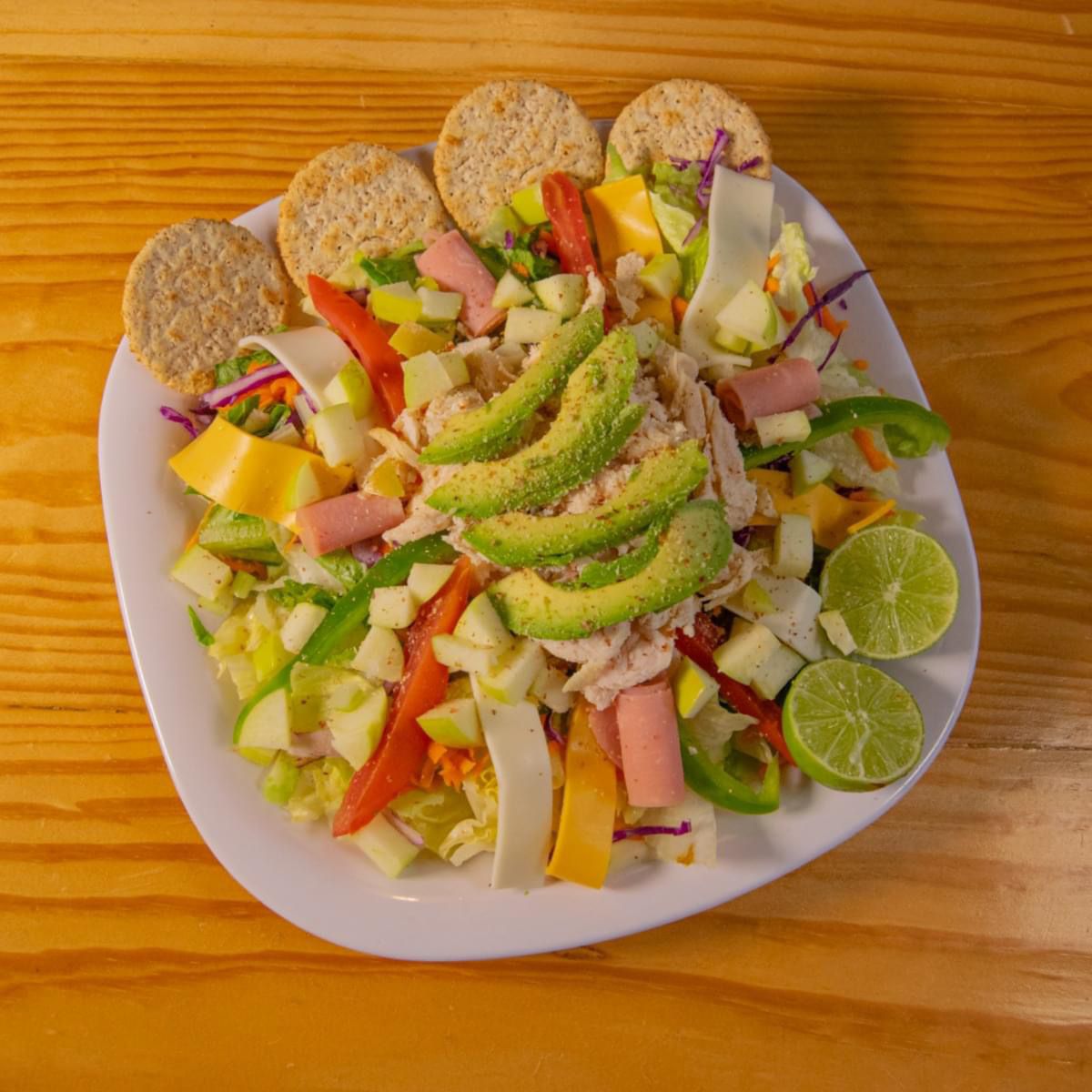 Deliciosa ensalada de pollo u atün, con opcion de elegir ensalada de coditos o papa.