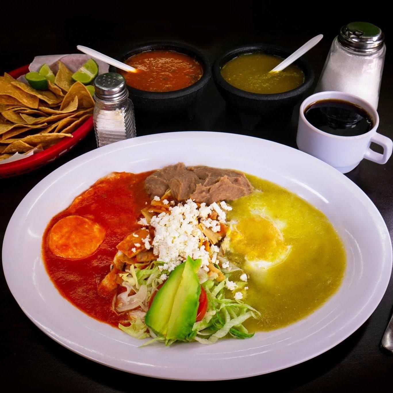 Dos huevos estrellados deliciosos con salsa roja y verde, porcion de frijoles. y aguacate,