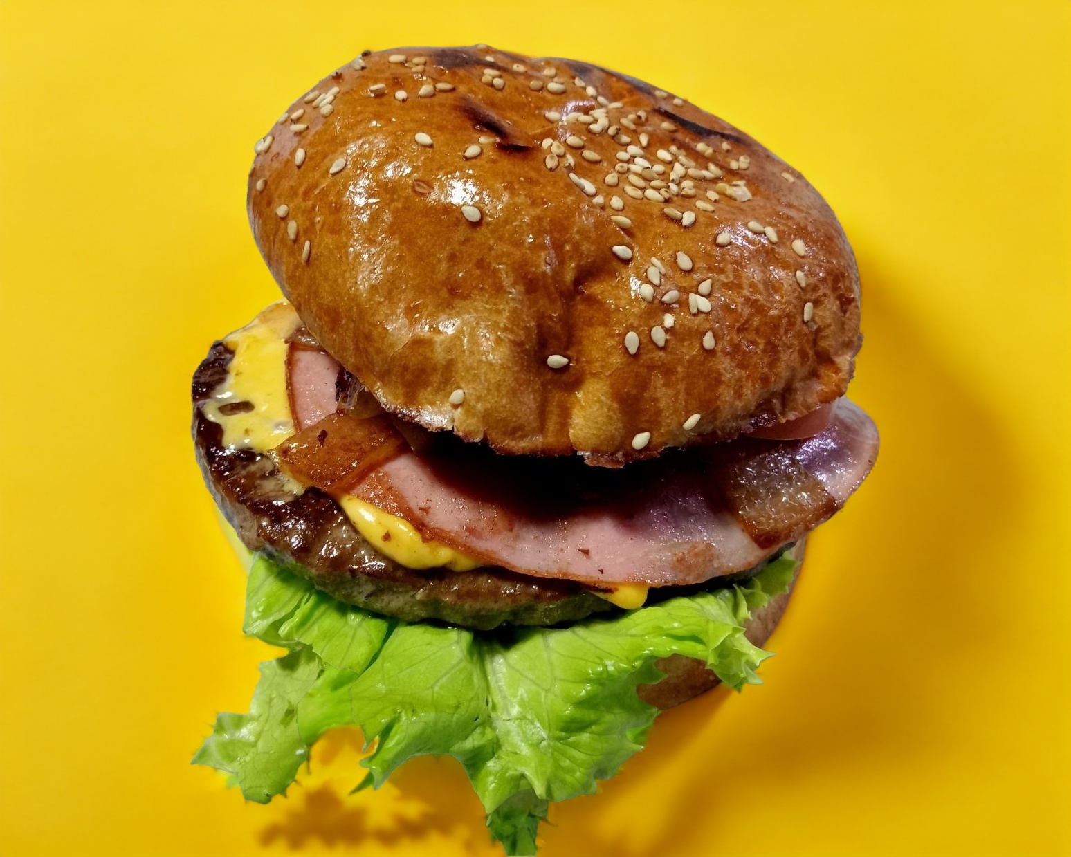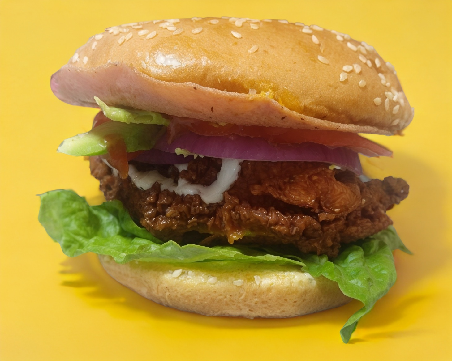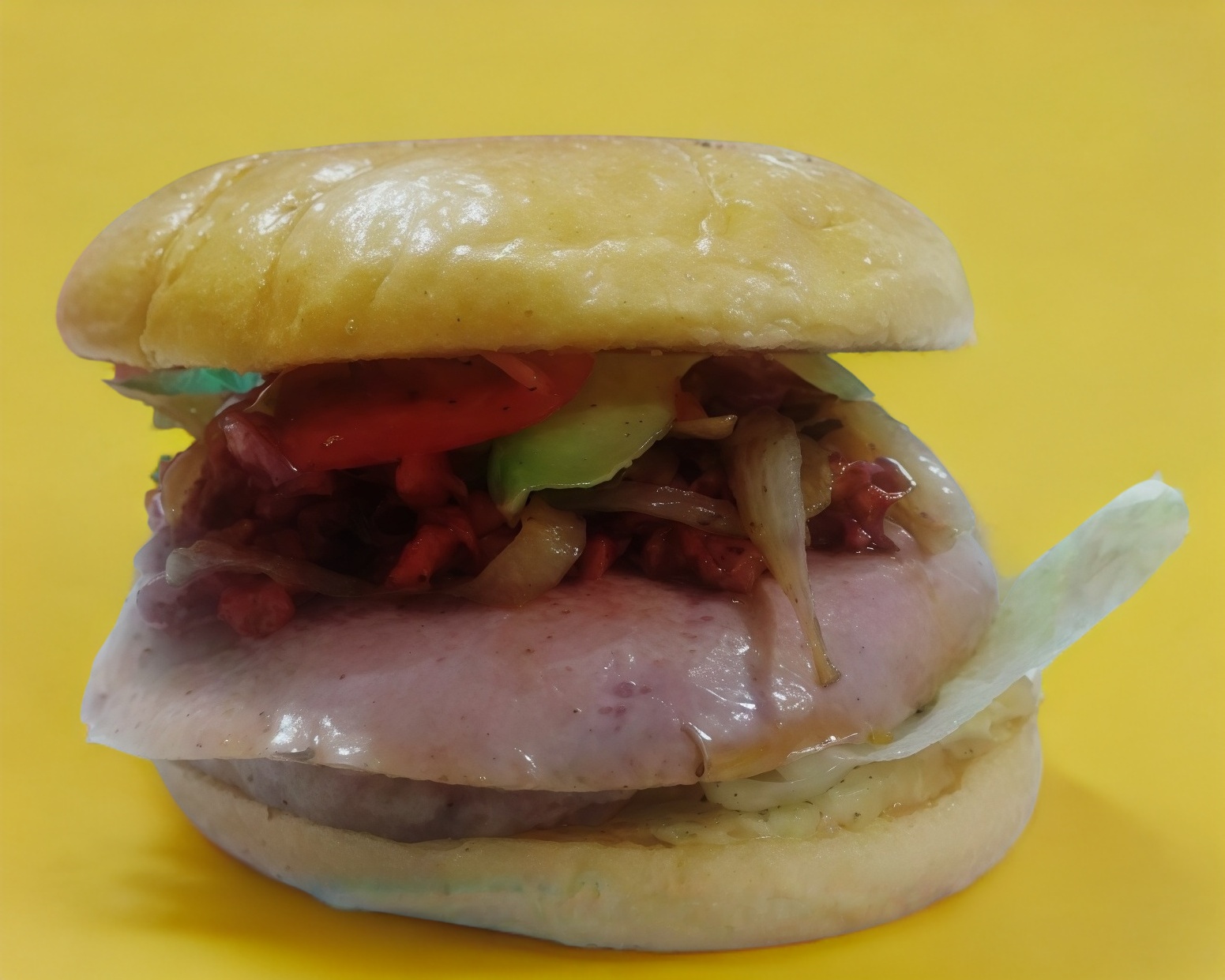 Hamburguesa de pechuga de pollo acompañada con Aguacate, tomate, lechuga, ranch. incluye porcion de papas.
