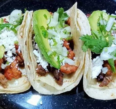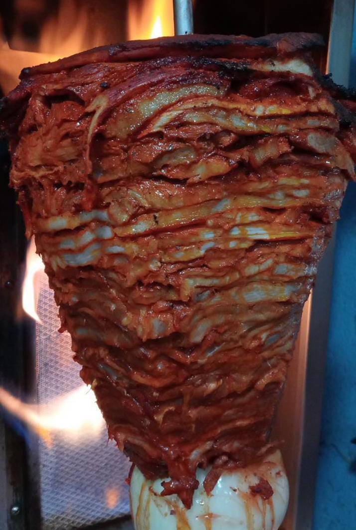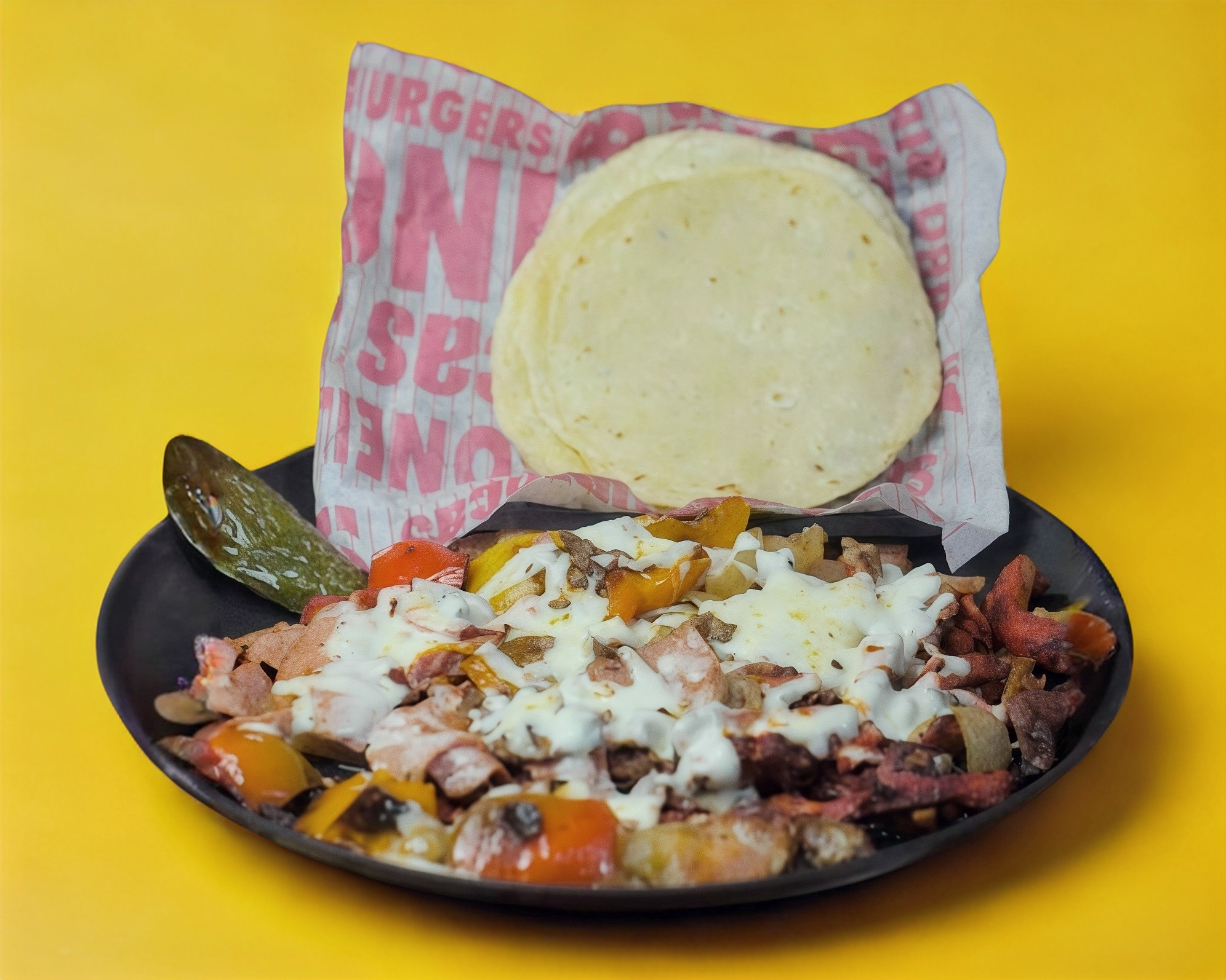 Mezcla de trompo y bistec, chile morron, jamon y queso asadero incluye 6 tortillas chicas.