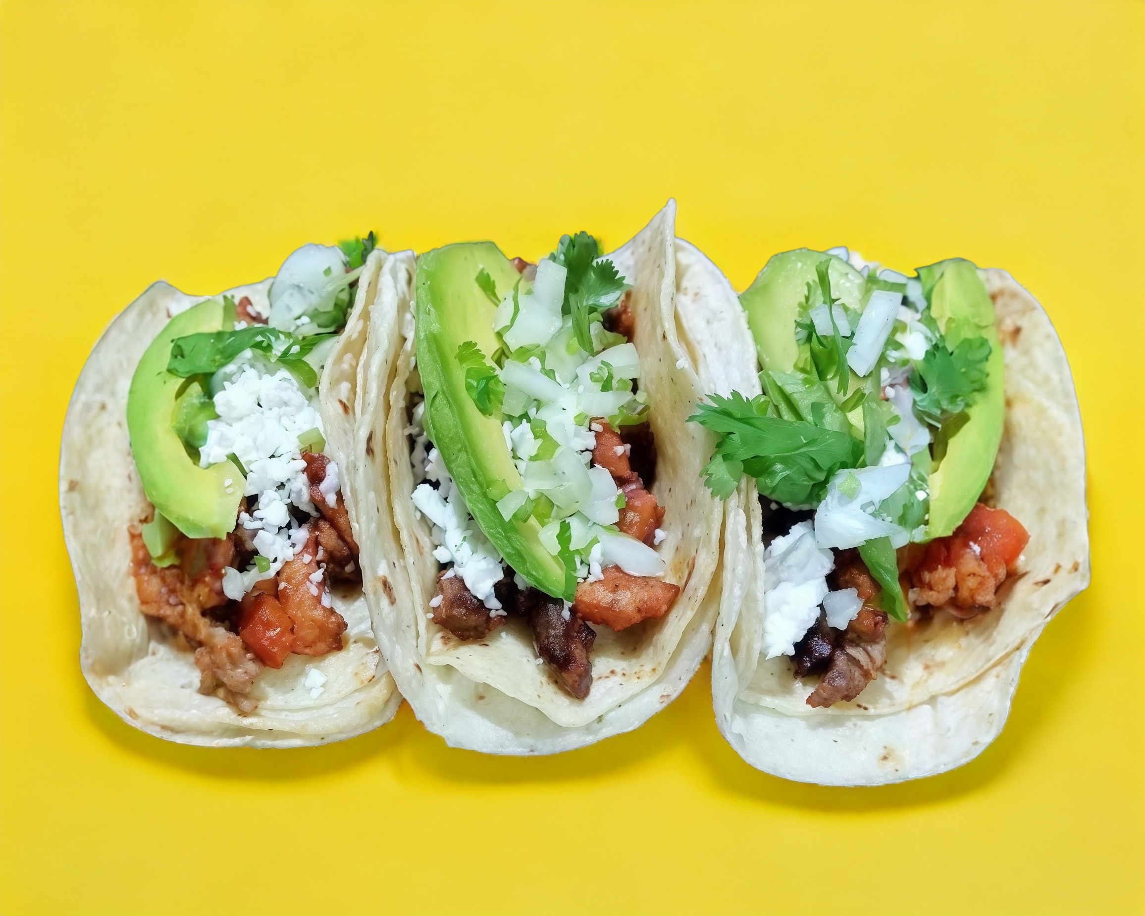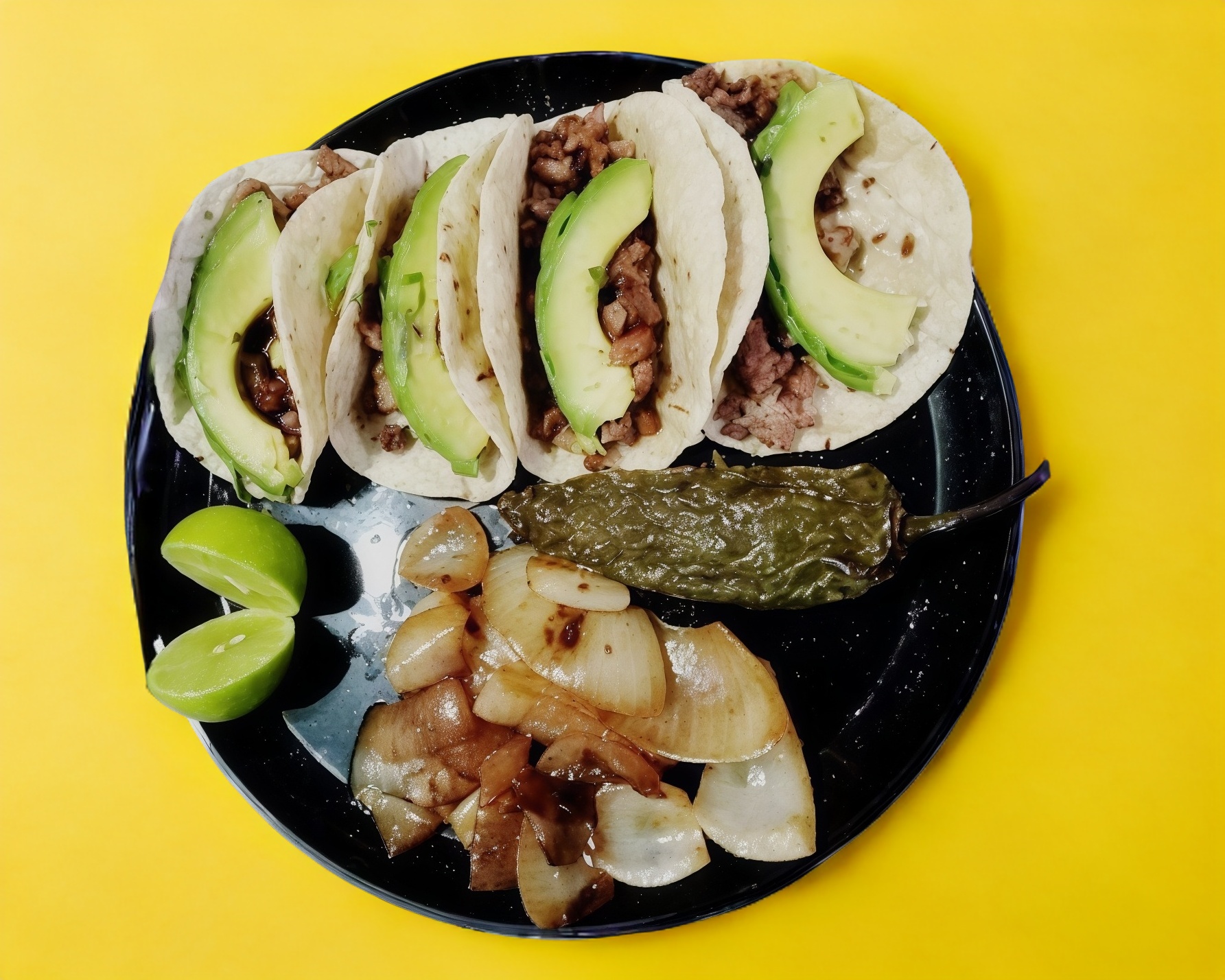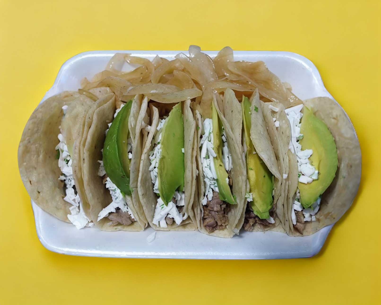 Tortilla de harina mixta(trompo y bistec) acompañada de queso asadero y aguacate.