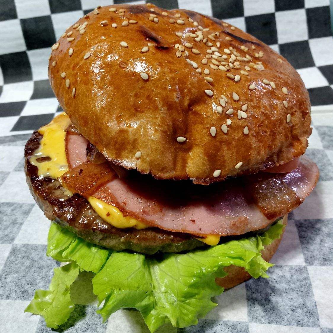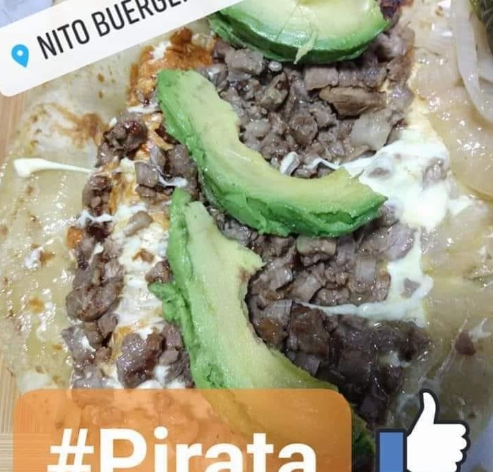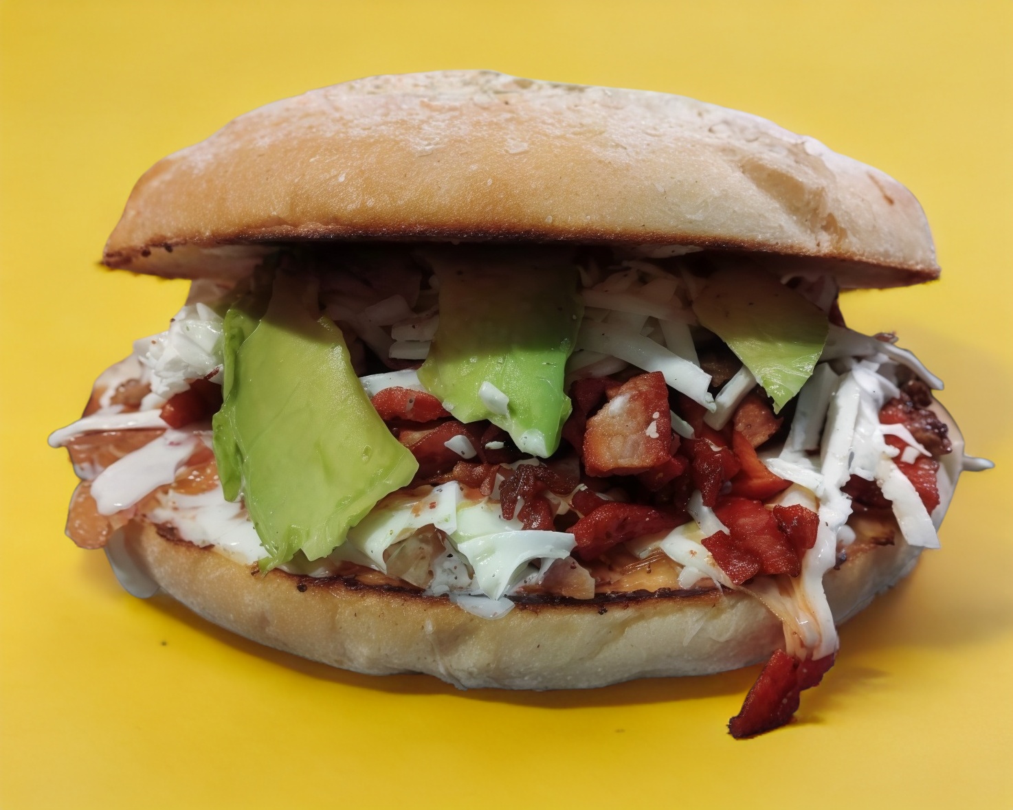 Carne de trompo, carne hamburguesa de arrachera, aderezos, lechuga, tomate, aguacate, cebolla asada, papas a la francesa.