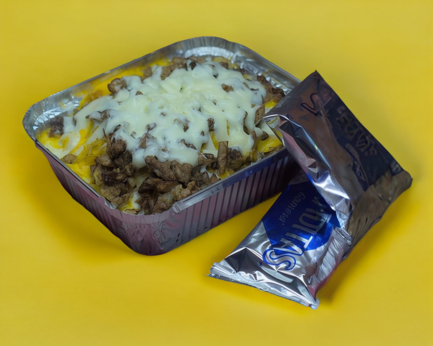 Papa asada acompañada de carne a elegir, queso amarillo, queso asadero y galletas saladas.