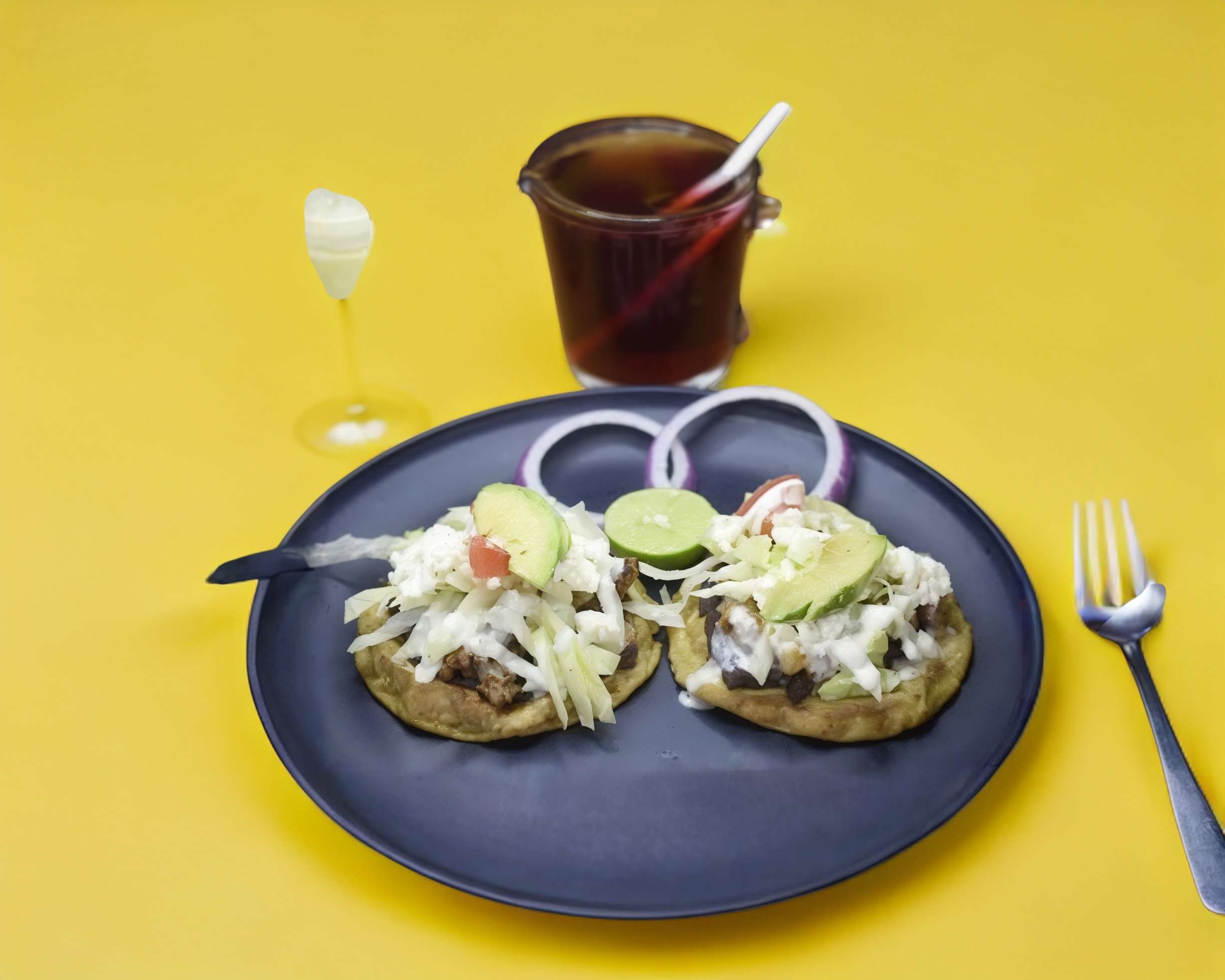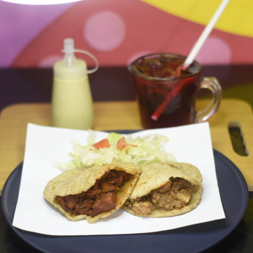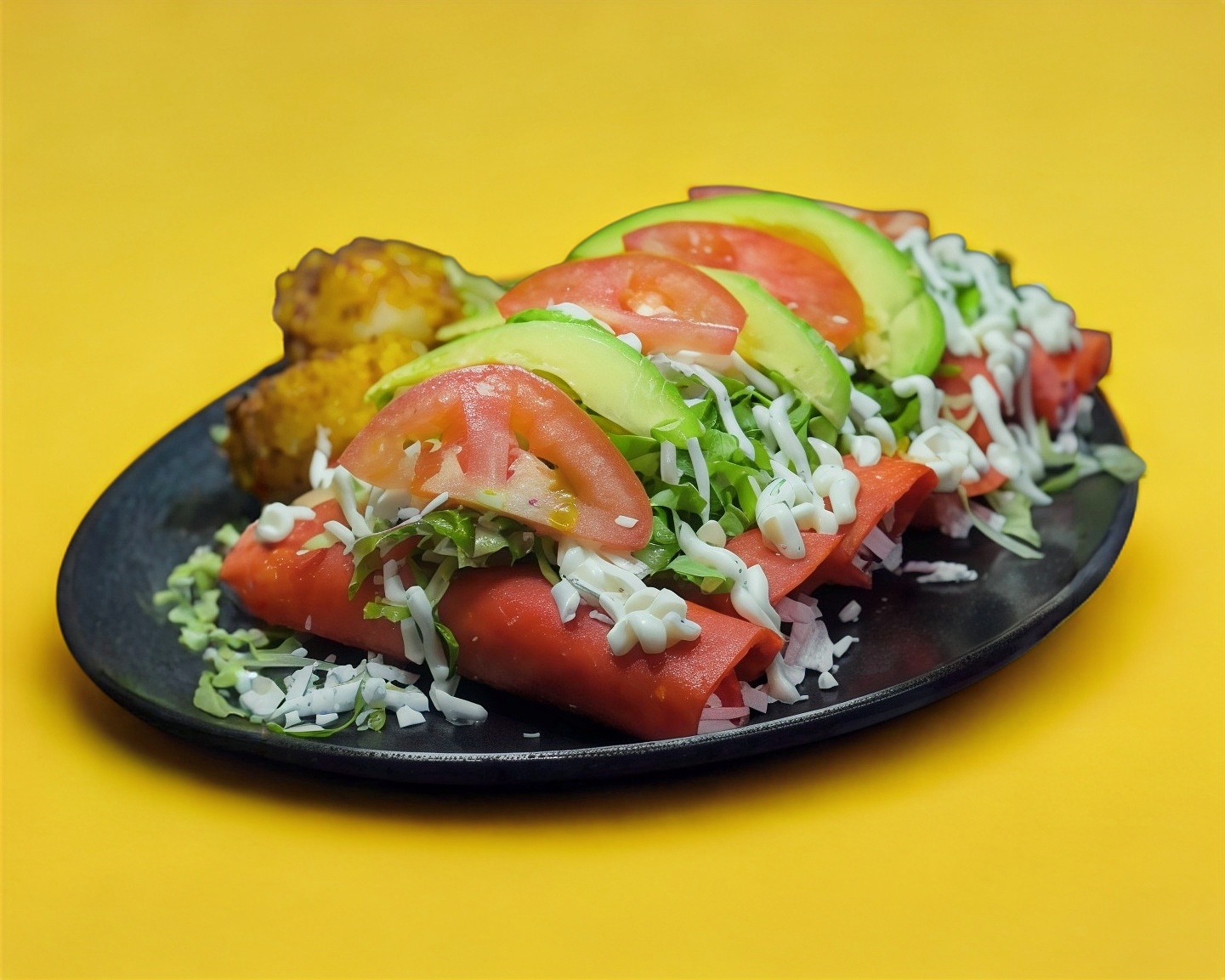 Tortilla roja rellenas de queso panela, lechuga, tomate, crema y papa adobada.