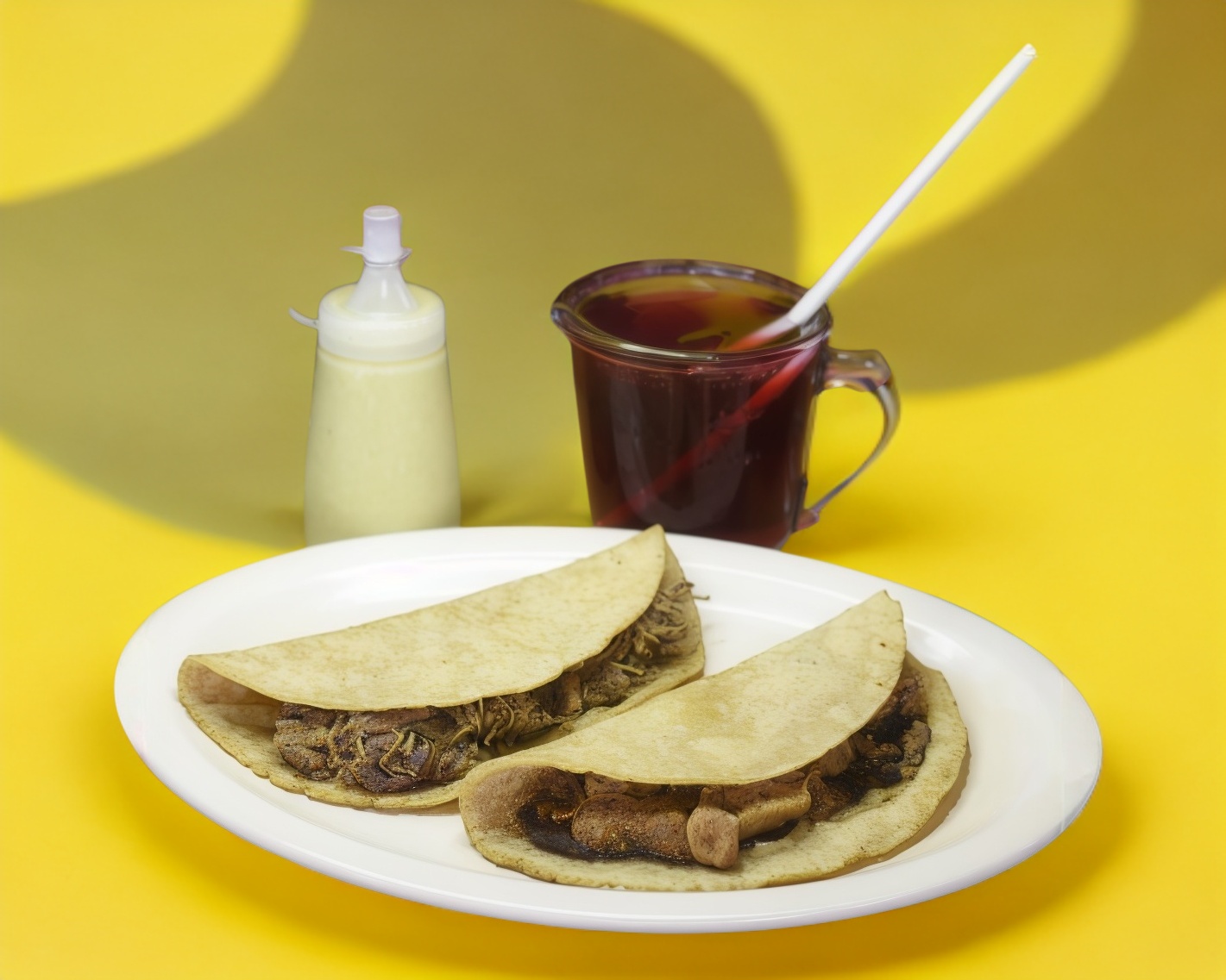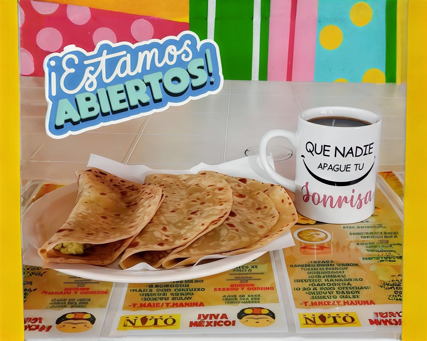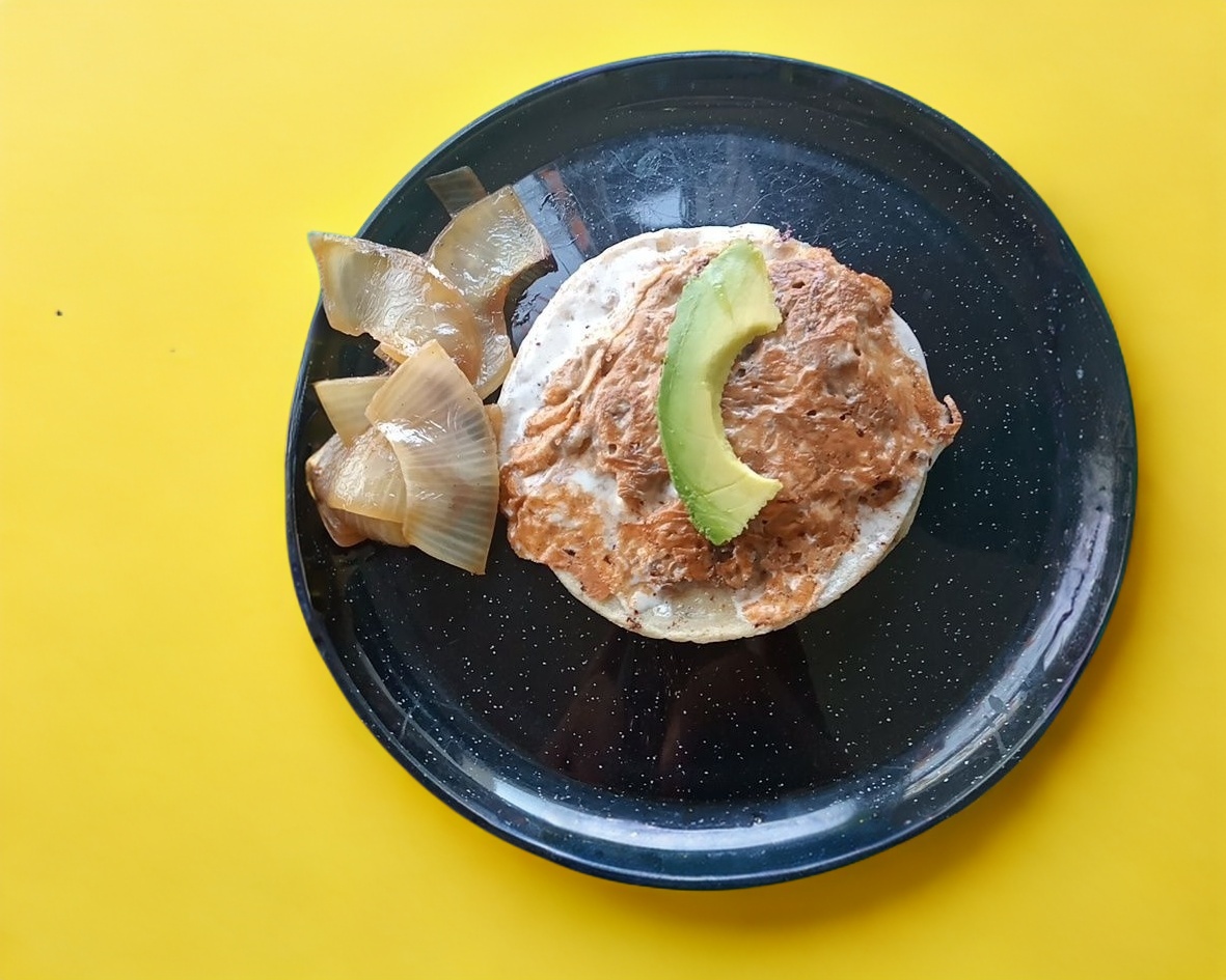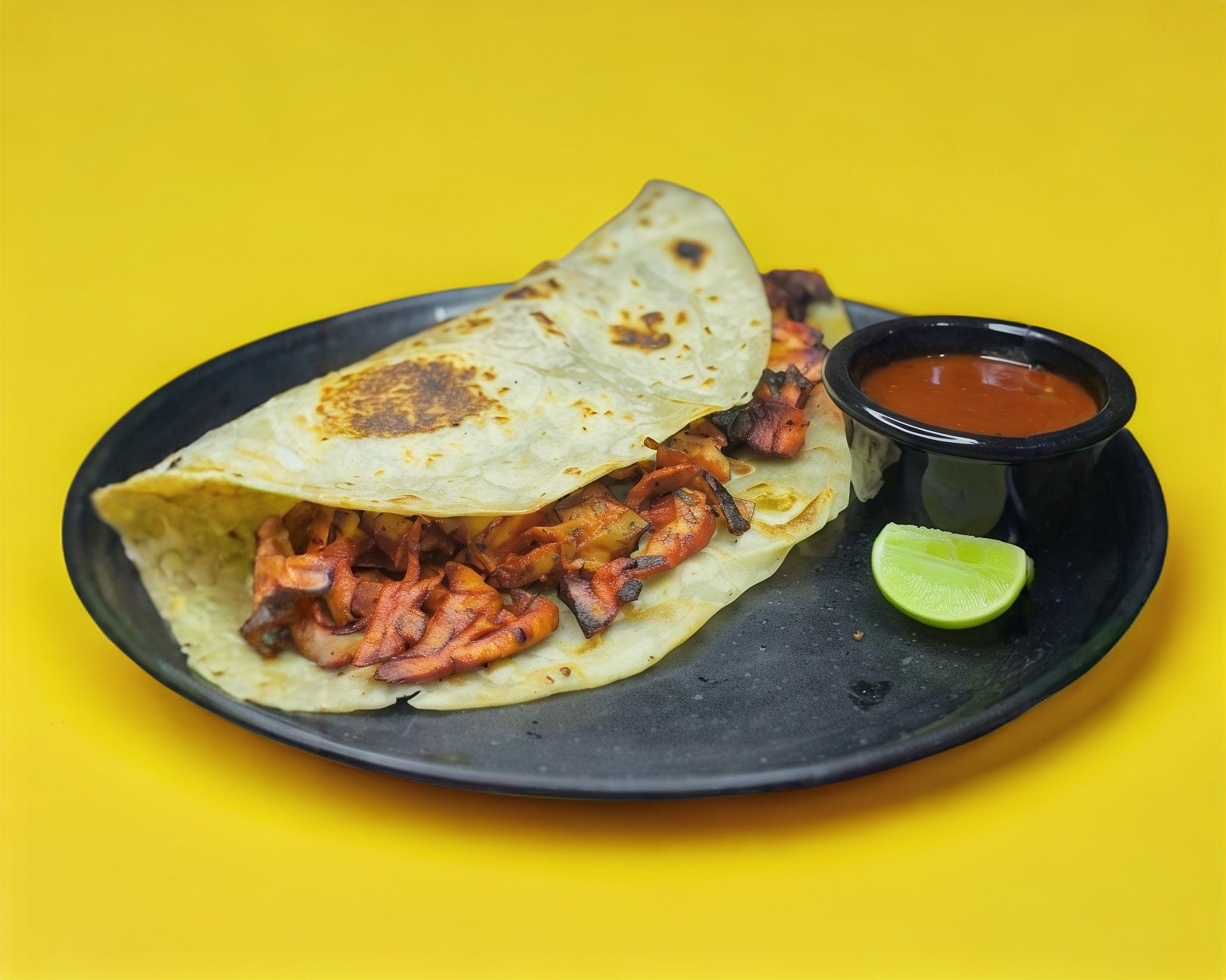 Tortilla roja rellenas de queso panela, lechuga, tomate, crema y papa adobada.