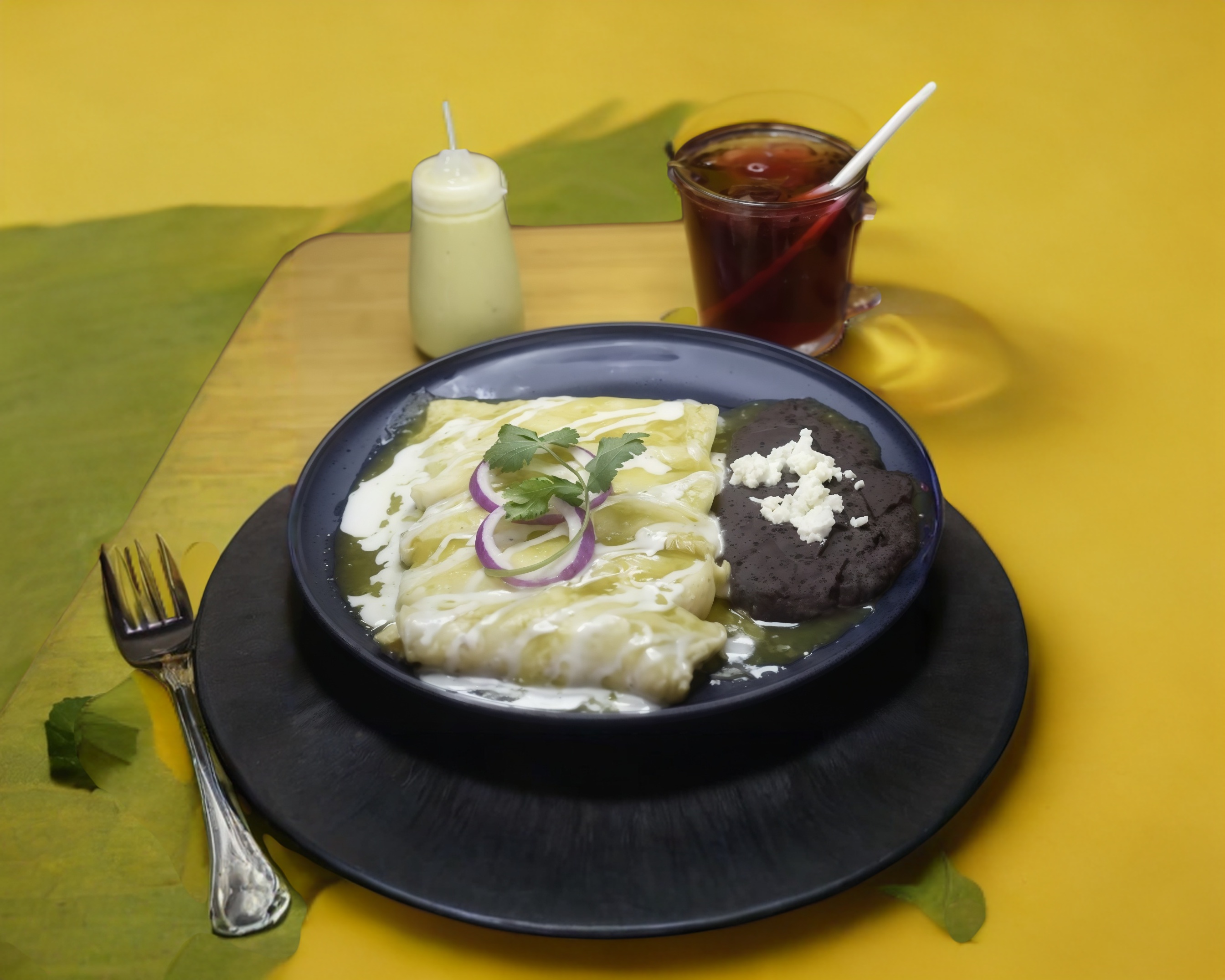 Rellenas de pechuga de pollo, queso manchego y crema. arroz y frijoles.