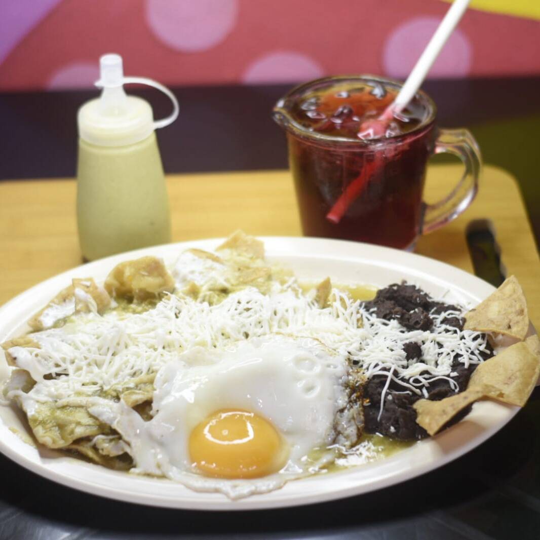 Totopos, salsa a elegir, queso manchego, crema acompañados de frijoles.