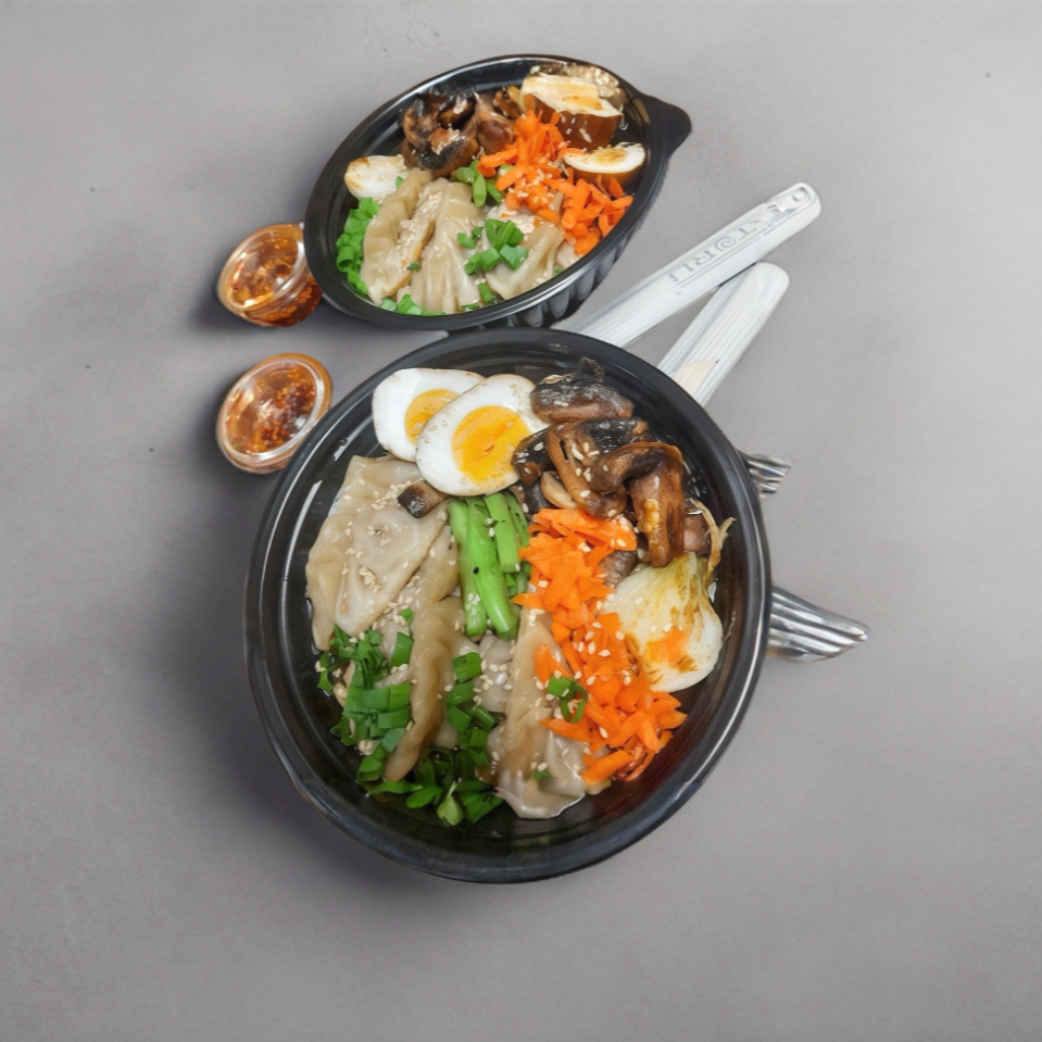 Ramen a base de pollo con 3 dumplings, acompañado de huevo marinado, ejotes, champiñones, cebolla, zanahoria, ajonjolí, cebollín fresco y salsa picant.