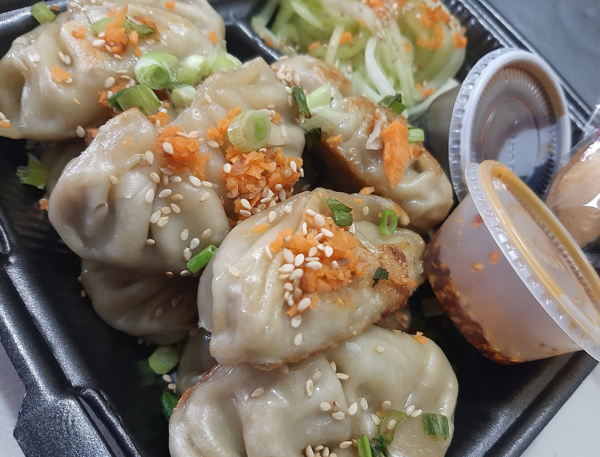 4 piezas de dumplings acompañados de tallarines, salsa a elección y refresco (355Ml)