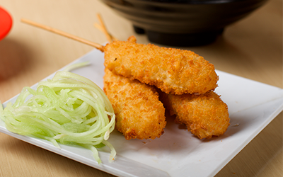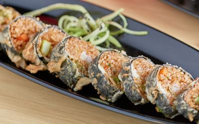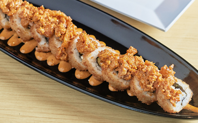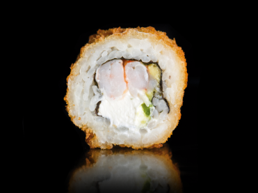 Camarón, aguacate y queso crema; bañado en salsa de anguila. Rollo caliente empanizado.