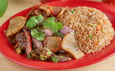 Delicioso salteado de res en una salsa de soya picante, acompañado de tomate, cebolla morada, brócoli, jalapeños y papas fritas.