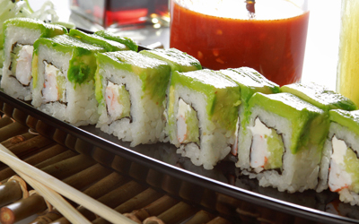 Camarón, queso crema y pepino por dentro y aguacate por fuera.