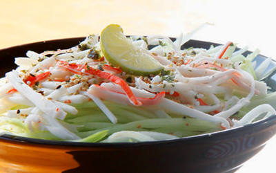 Ensalada con pepino y surimi contiene ingredientes frios con topping horneado.