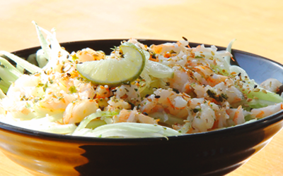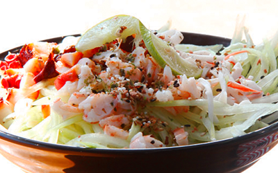 Pepino y camarón.* Contiene ingredientes fríos con topping horneado.